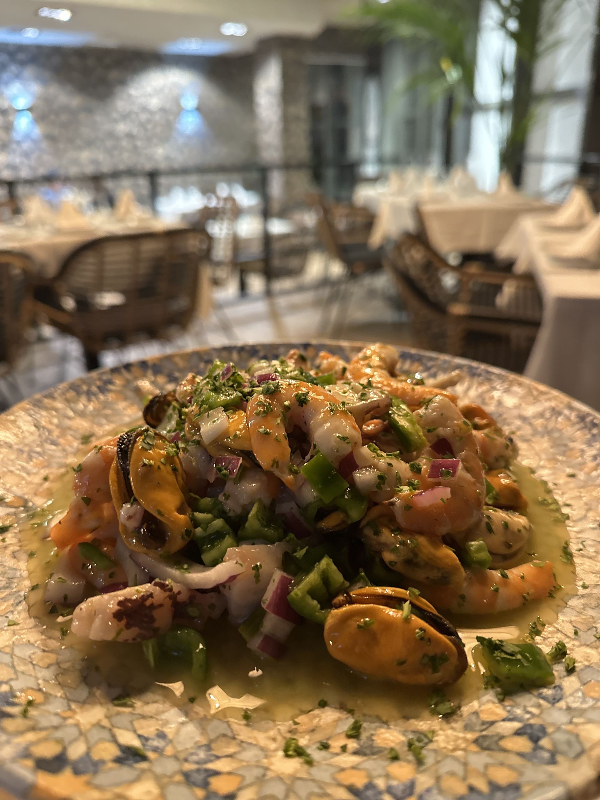 Si hablamos de producto de calidad y de temporada también tienes que prestar atención a las sugerencias que te traen fuera de carta como un maravilloso salpicón de langostinos, pulpo y mejillón, una ración abundante y con gran protagonismo del marisco fresco.