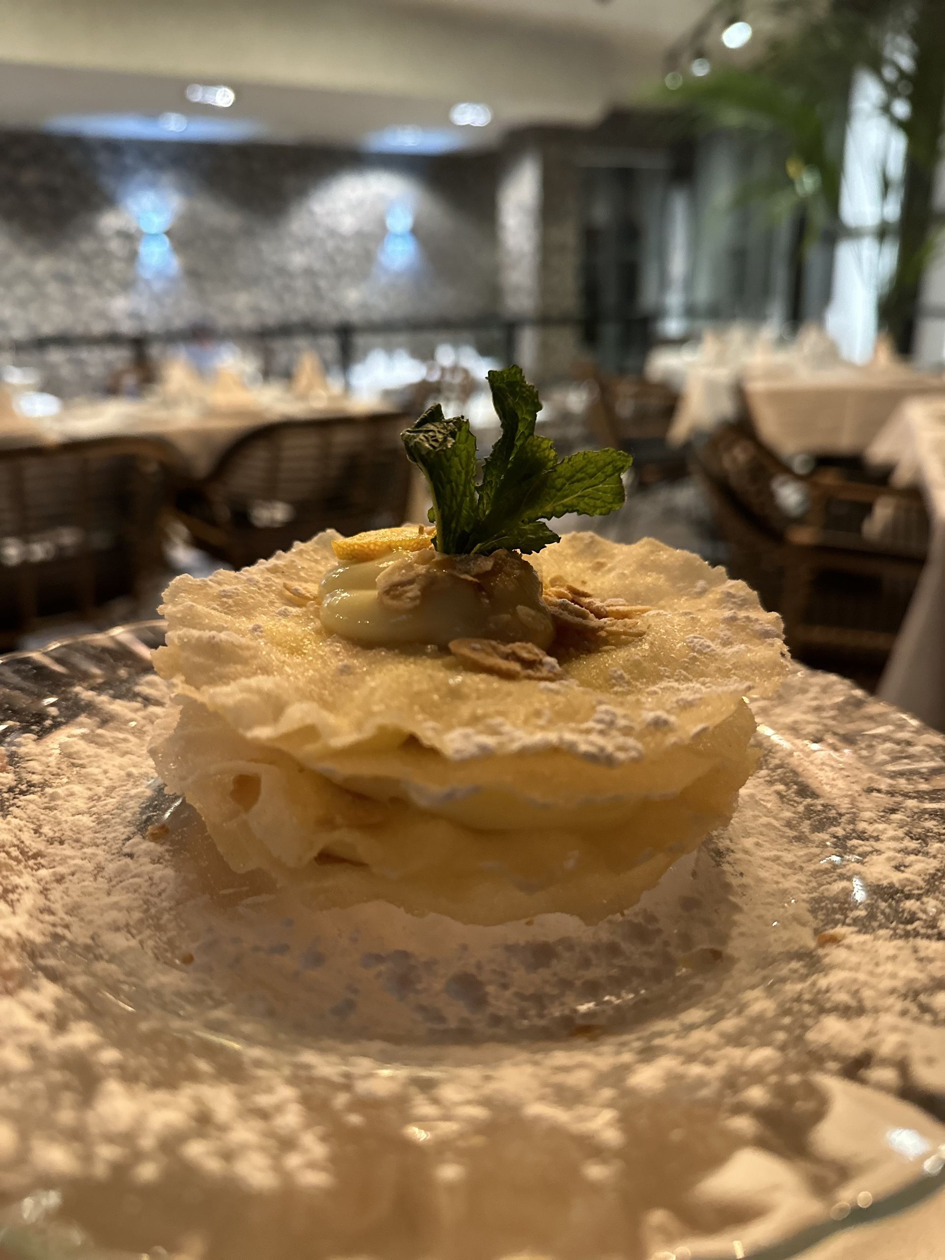 Terminamos una maravillosa cena con una espectacular tarta árabe, con la masa filo recién horneada que queda crujiente hasta en la zona que empapa la buenísima crema que sirve de cimiento para esa milhojas de placer.