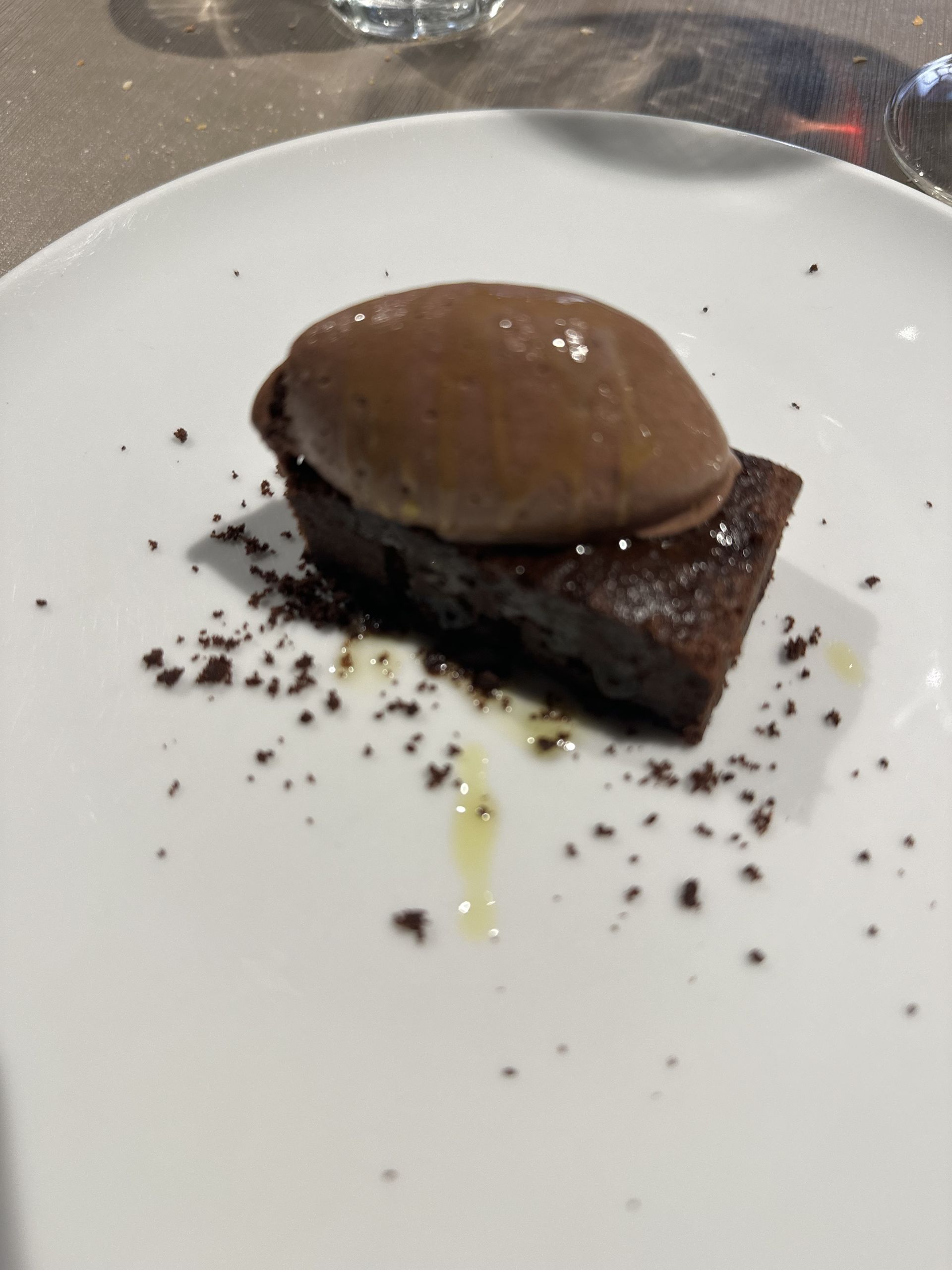 El postre llamado muerte al chocolate, un buen brownie con chocolate Valhrona al que si le añades un chorrito de AOVE Finca la Torre lo mejora.