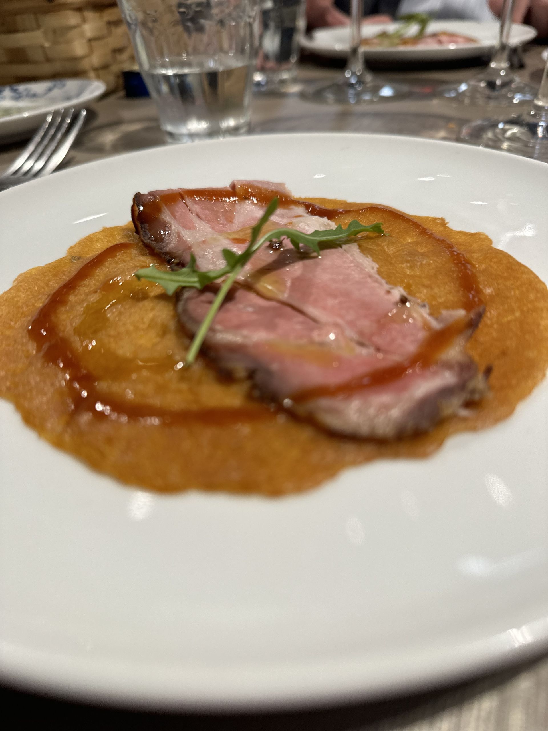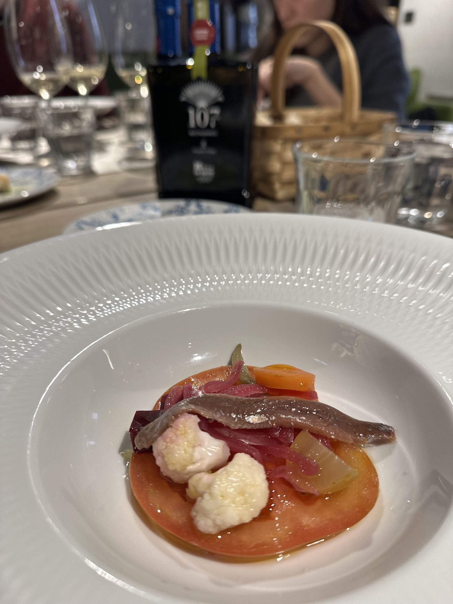 Muy buena ensalada de tomate con encurtidos y octavillo de anchoas. Los encurtidos los prepara el propio Joaquín Felipe en el restaurante y da muestras del respeto por el producto que se mantiene en esta casa.
