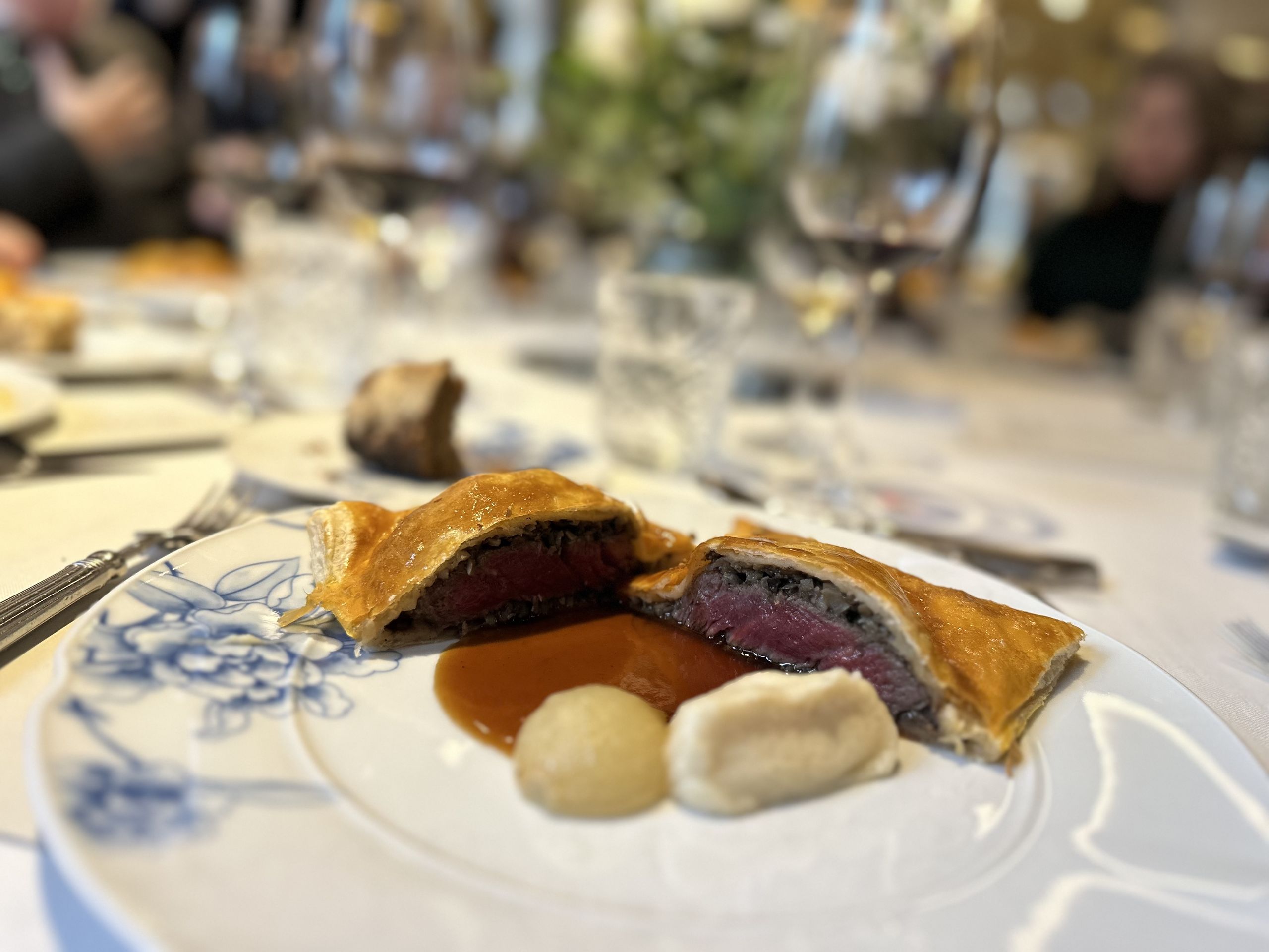 Con el buen vino tinto Licinia, de Bodegas Licinia y DO Vinos de Madrid, llega un delicioso solomillo Wellington de venado con duxelle, demiglace y puré de apio nabo (33€). Rematamos el menú con unas muy buenas migas de chocolate con espuma de leche, frambuesas y helado de yogurt (12€).