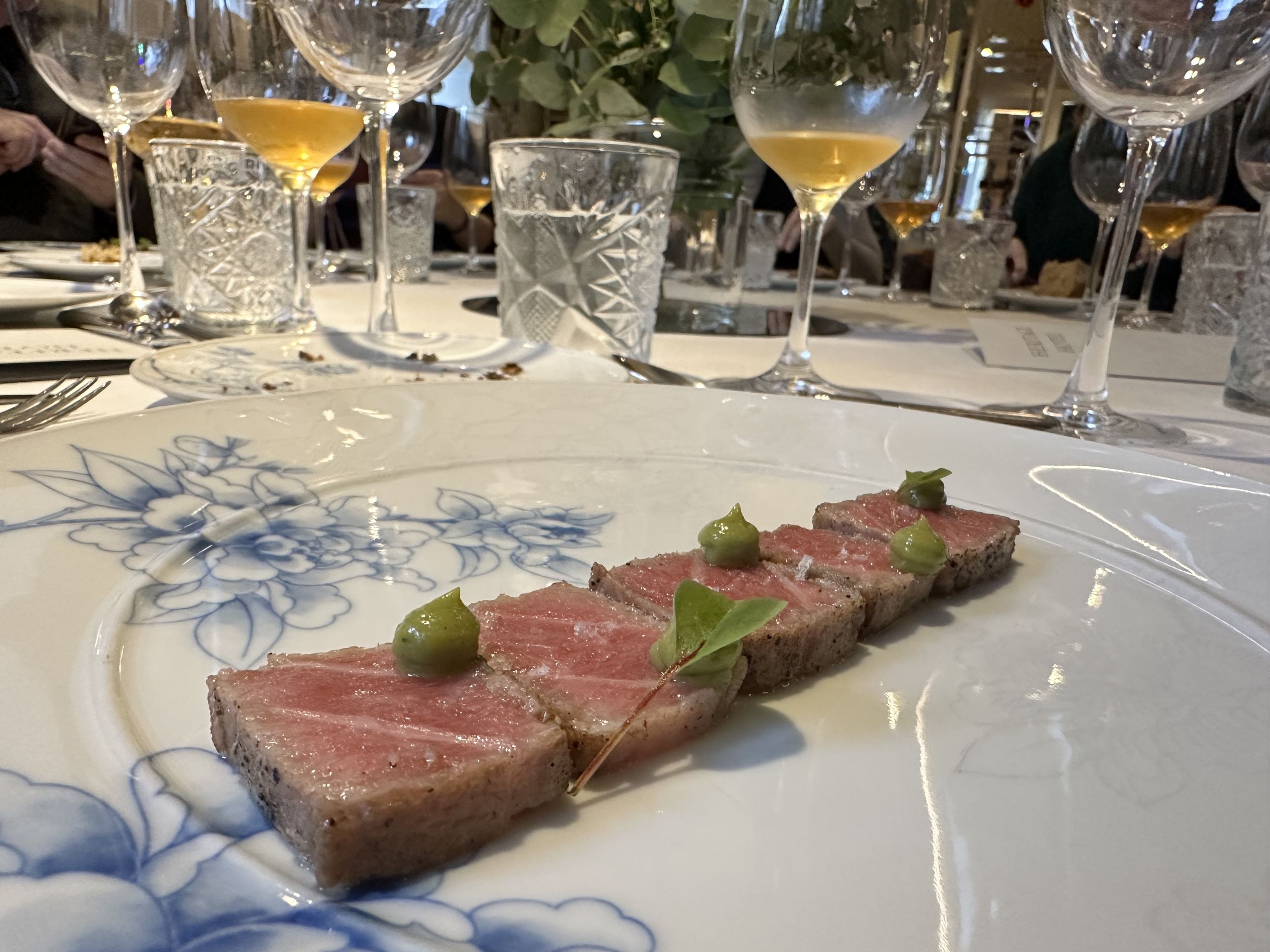 El chef tiene como bandera el respeto al sabor de los ingredientes que conforman cada plato de una carta que acerca al comensal al placer de la alta gastronomía. Para estos primeros bocados nos sirven un buen vino blanco Gatuno Orange de Bodegabierta y DO Vinos de Madrid. Como el fantástico tataki de atún rojo con mojo verde que nos sacan fuera de carta y que tiene el punto justo de la brasa para que la grasa del atún brille con luz propia.