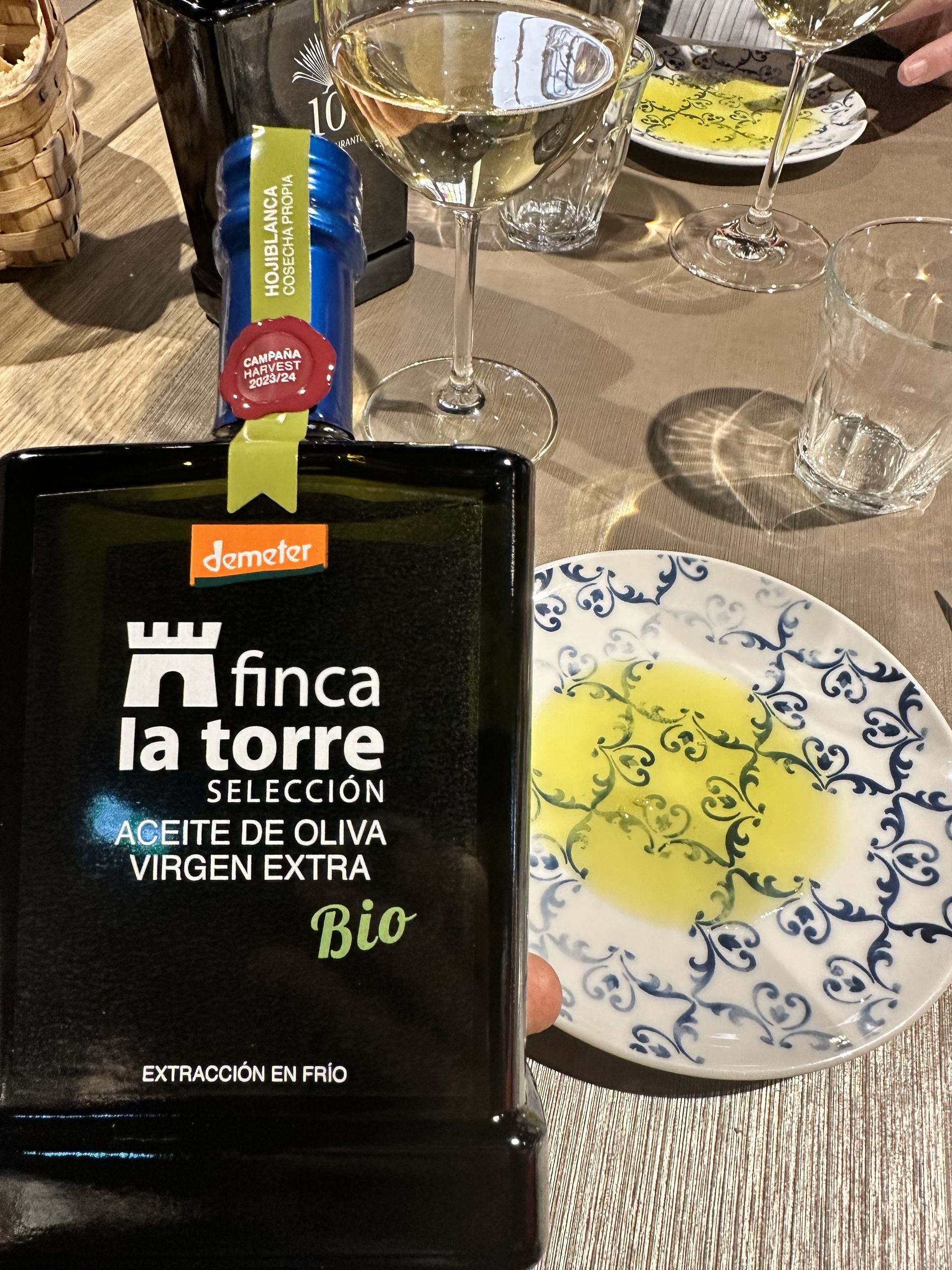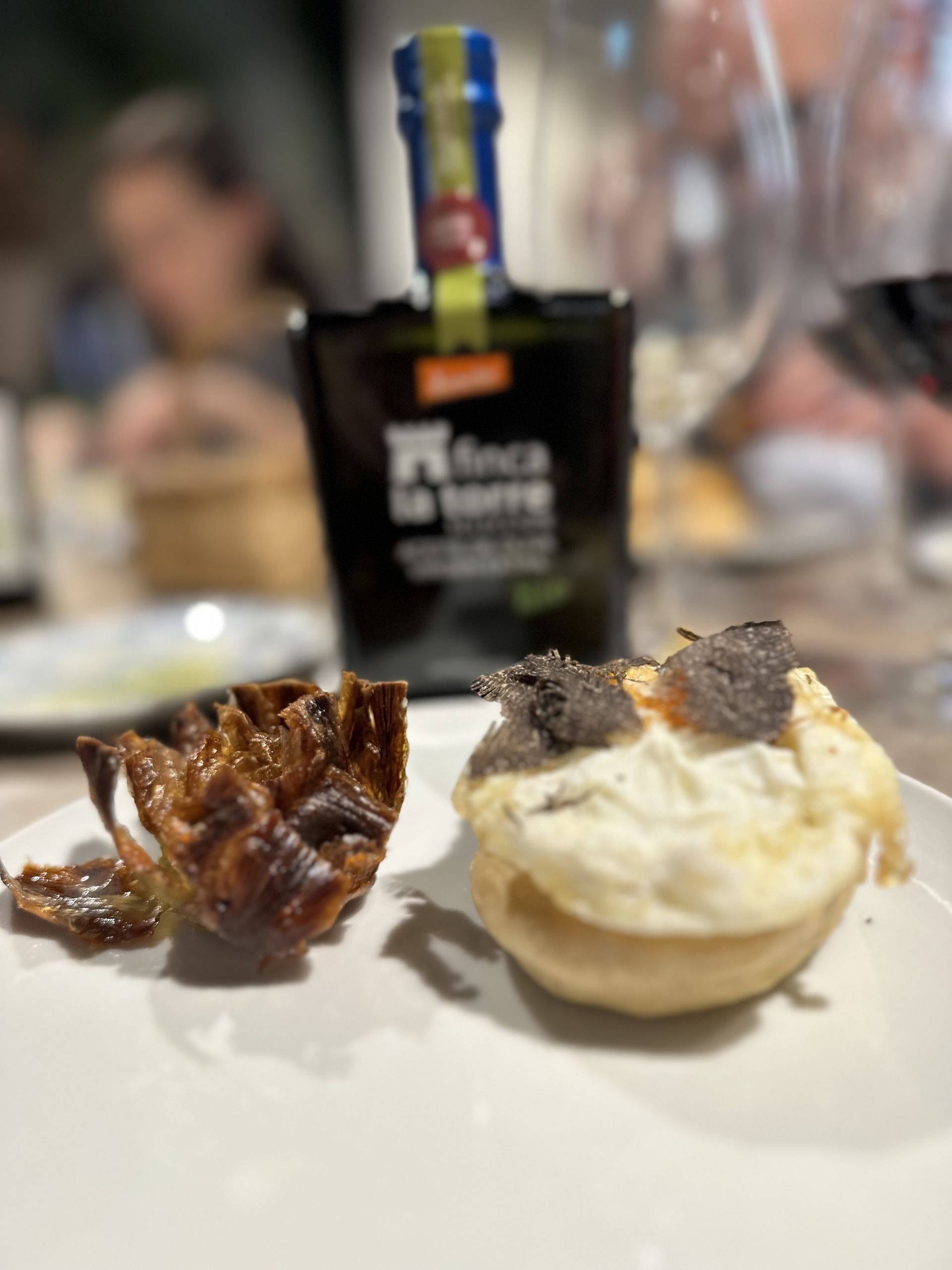 Así que comenzamos deleitándonos con este oro líquido –nunca mejor dicho con el precio que está alcanzando en la actualidad, aunque un producto de esta calidad bien merece el gasto, la botella de 500 ml cuesta 18,15€– directamente de la botella para untar pan sin parar. Aquí ya notas las características de una AOVE único ganador de cinco premios Alimentos de España. Su aroma es afrutado intenso, con recuerdos a hierba recién cortada, hoja de olivo y tomatera, mientras que en boca se percibe un ligero amargor a la entrada y un picor progresivo, persistente y equilibrado con toques de almendra verde, manzana y cáscara de plátano. Este aceite procede de aceitunas obtenidas de olivos de entre 100 y 130 años de antigüedad, cultivados según prácticas de agricultura ecológica y biodinámica con el objetivo de obtener el aceite más puro y de la mejor calidad posible.