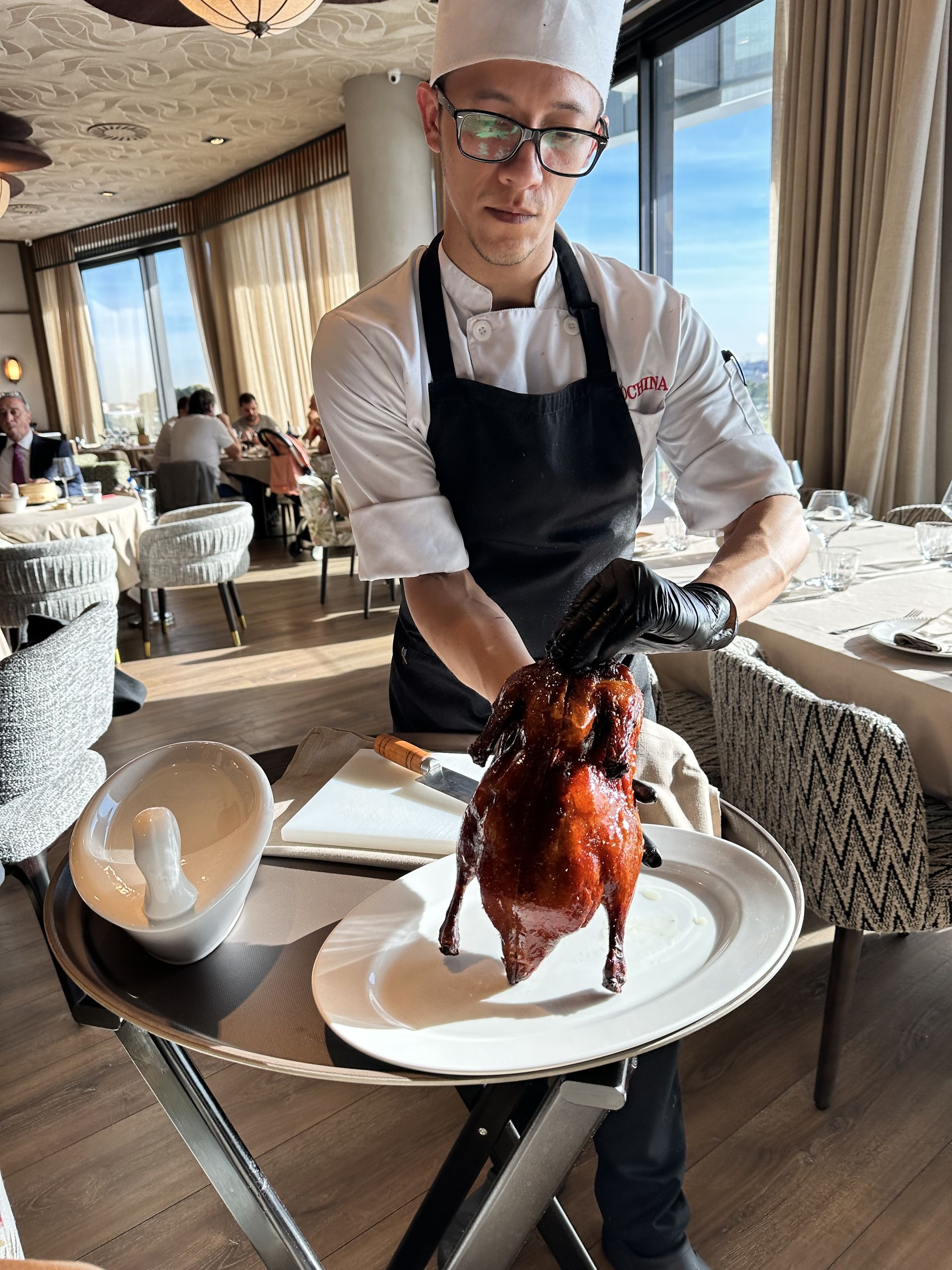Como os decía, la joya de la corona, además de la carne y las brasas, es el pato imperial Beijing (M 55€ / E 85€), especialidad del Grupo China Crown y elaborado en un proceso que dura tres días, con 18 horas de marinada y dos días de laqueado y secado. No te pierdas la explicación del chef quien mientras prepara el pato te explica ese cuidado proceso.