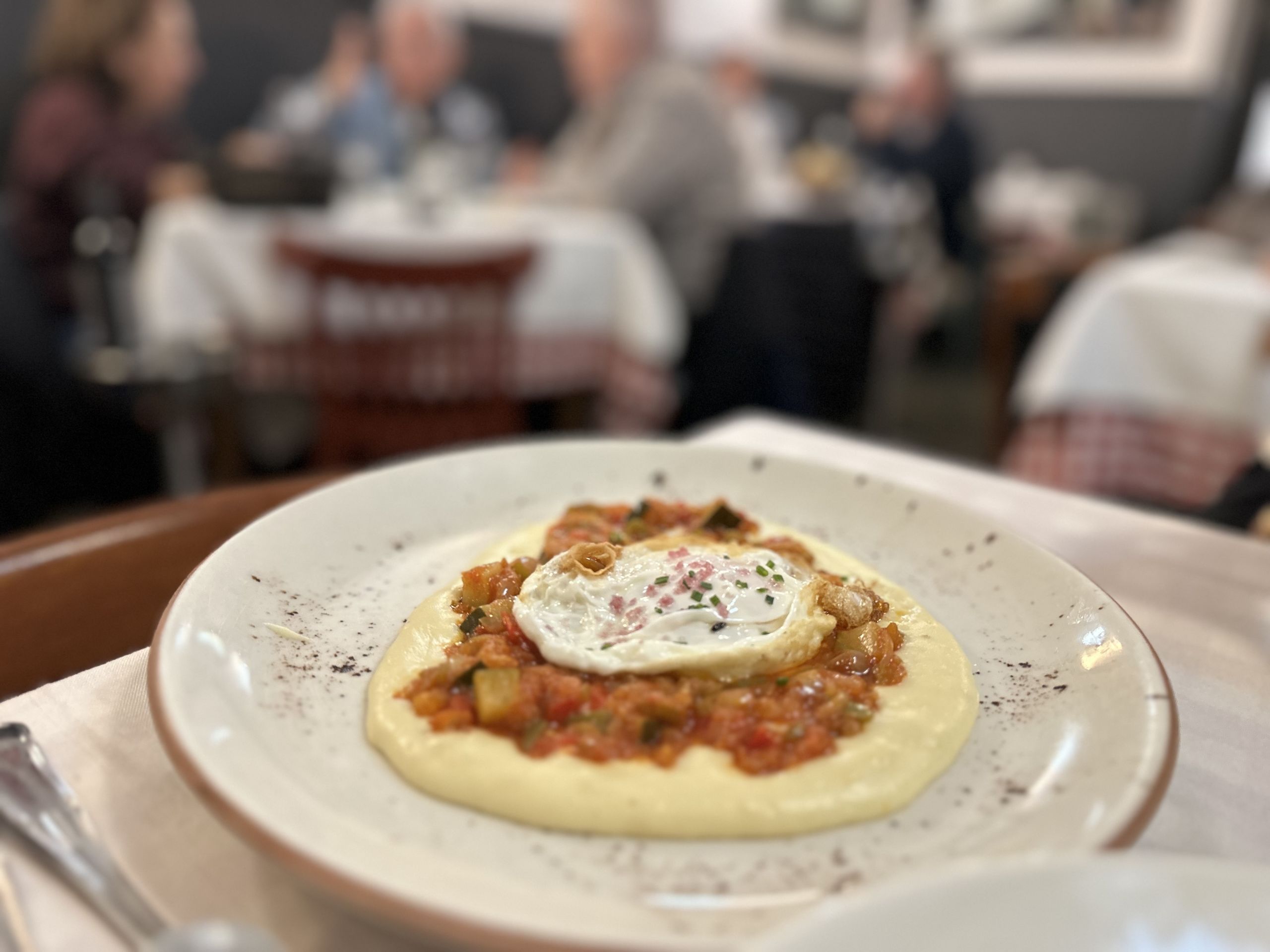 De esos platos del día nos encontramos con un buenísimo pisto con huevos y parmentier de patata, un plato en el que el suave puré suaviza el sabor de las verduras y complementa de forma maravillosa con los huevos fritos.