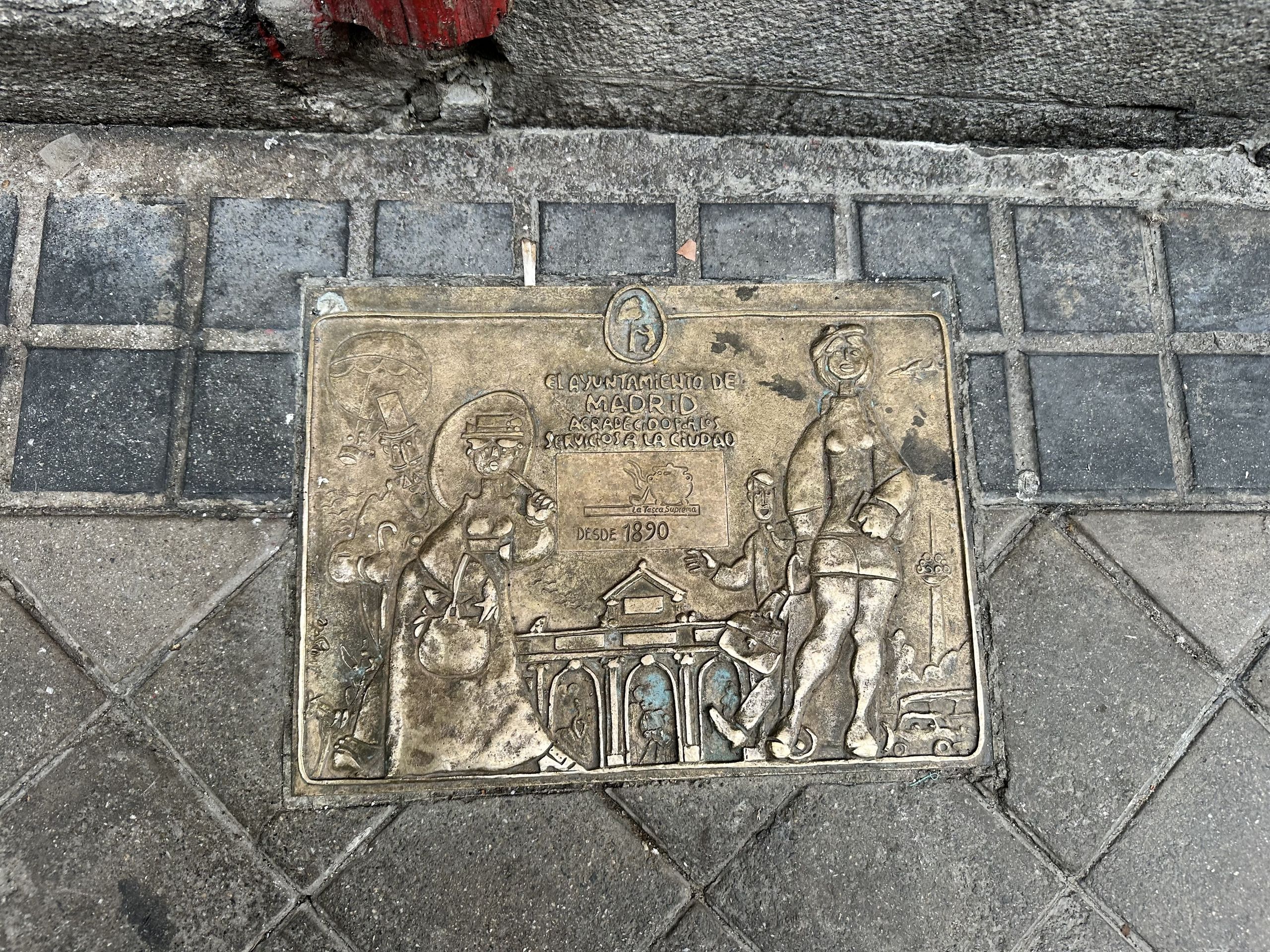 La placa identificativa del Ayuntamiento de Madrid en la que "agradece los servicios prestados a la ciudad desde 1890" y que está en el suelo de la entrada de La Tasca Suprema.