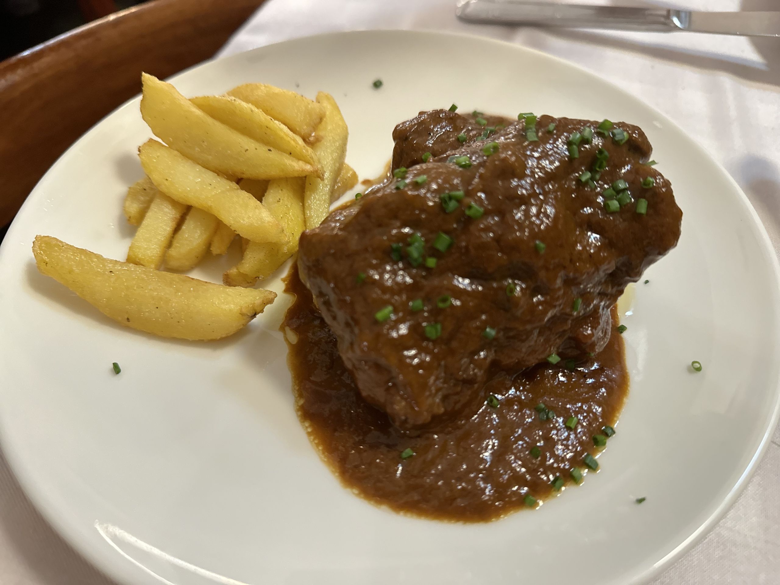 Para terminar este recorrido centenario de oreja y vuelta al ruedo, un espectacular rabo de toro con demiglace y patatas, también para nota, al igual que las patatas fritas que acompañan los platos y que son adictivas.