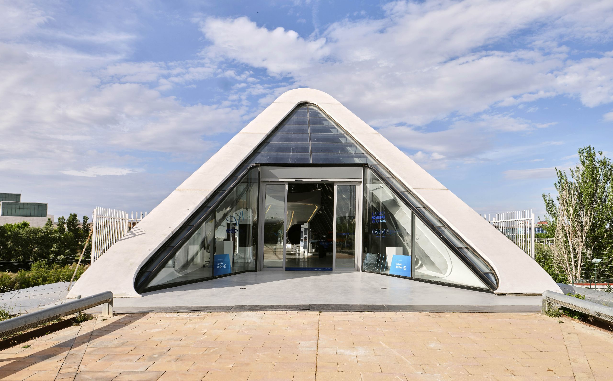 Zaha Hadid, la única mujer que ha ganado el premio Pritzker de arquitectura, diseñó el edificio que ahora ocupa el Mobility City para la Expo del año 2008. Desde entonces la crisis económica mantuvo el pabellón – puente sin ningún uso.
