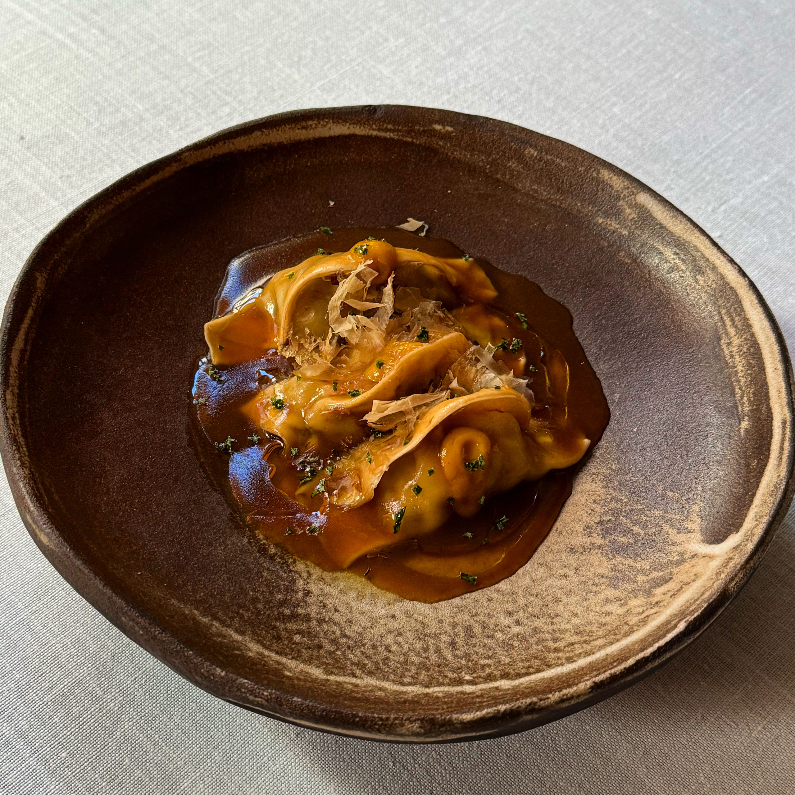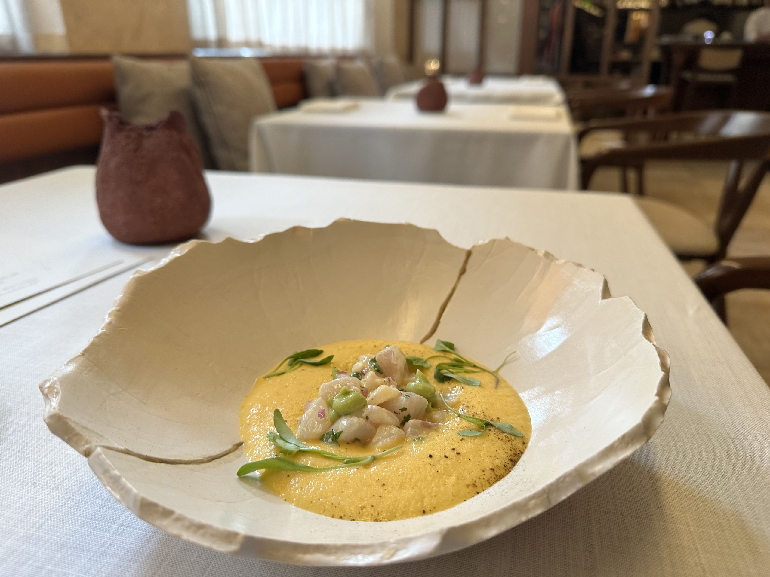 Uno de los mejores platos del menú, las gyozas de verduras y langostinos, que Andrés las prepera con el relleno marcado al vapor acompañadas con un suquet thai, terminado con puré de zanahoria asado con dashi no moto y katsuobushi.