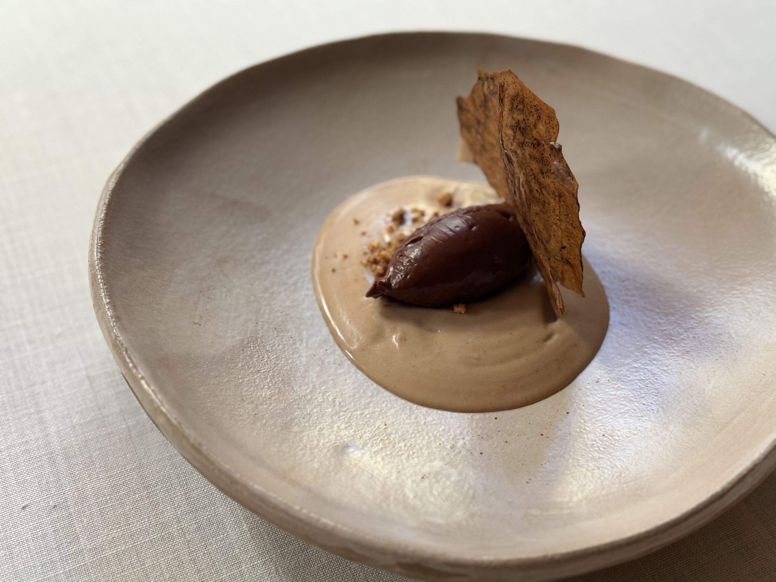 El postre que nos saca Andrés Madrigal es ese homenaje que tanto se está poniendo de moda al pan con chocolate de toda la vida. En esta ocasión es chocolate con puré de castaña y AOVE, la teja es de pan de cacao.