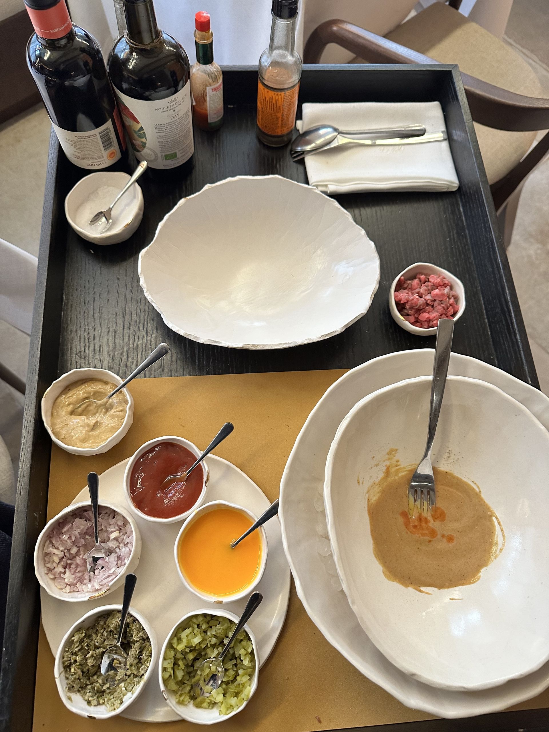 El steak tartar clásico te lo preparan previamente en la mesa y después lo retiran para que la carne adquiera los sabores del aderezo.