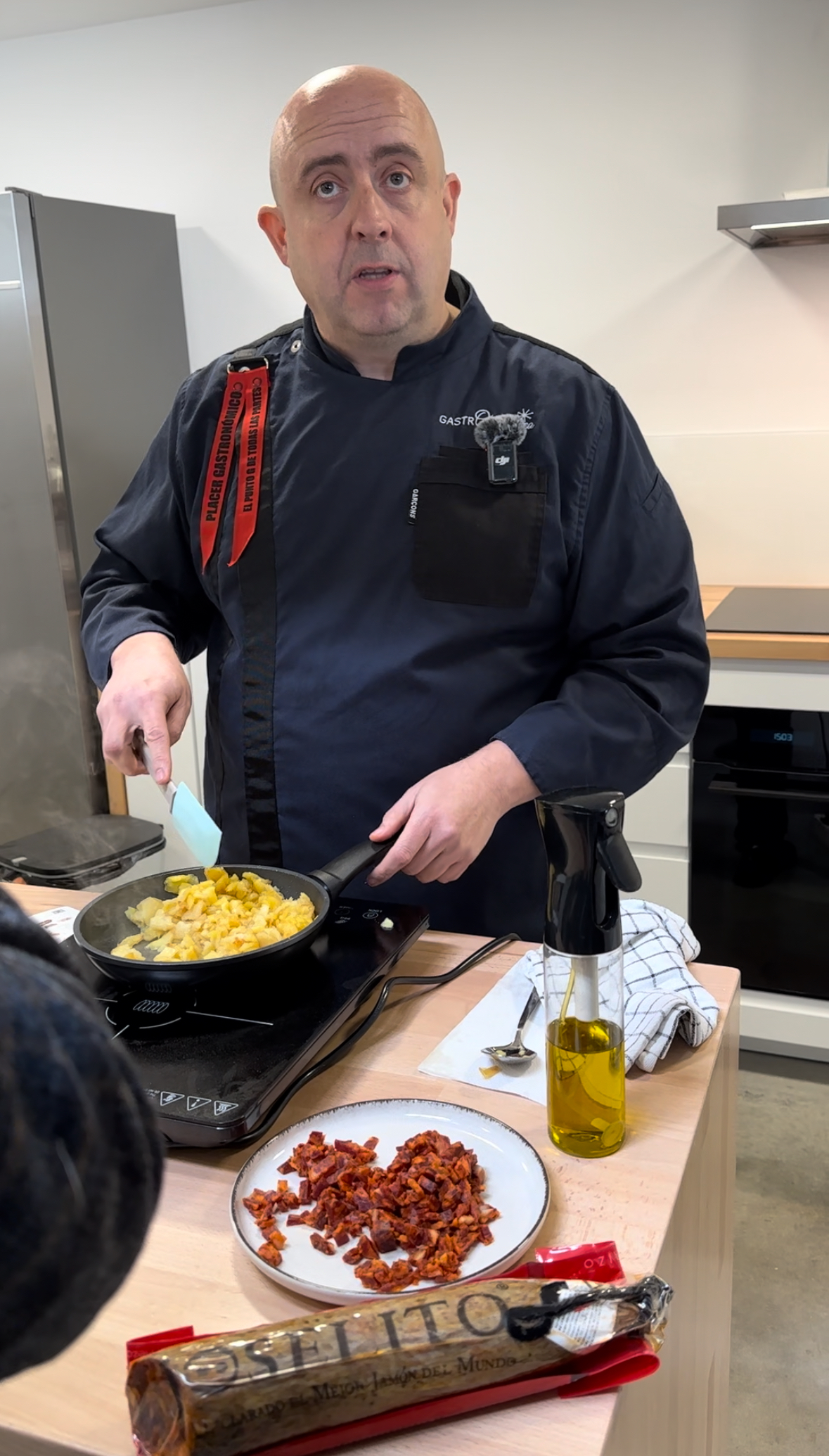 Marcelino Alonso, más conocido en redes como Gastrorgásmico, elaborando su tortilla de patata con chorizo Joselito y el preparado de Cobardes y Gallinas.