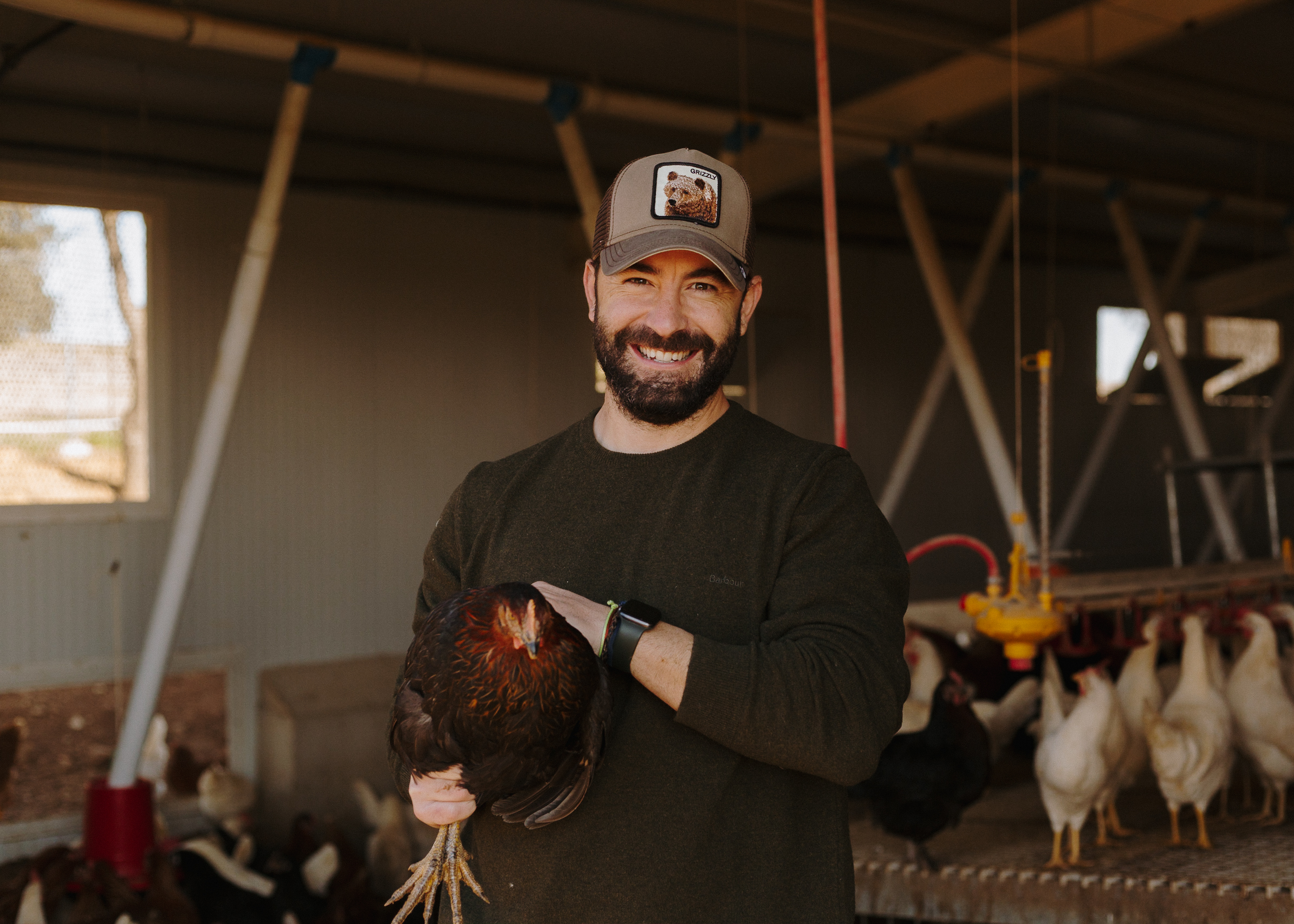 Jorge Camacho, funfador de Cobardes y Gallinas, posa con una de las gallinas.