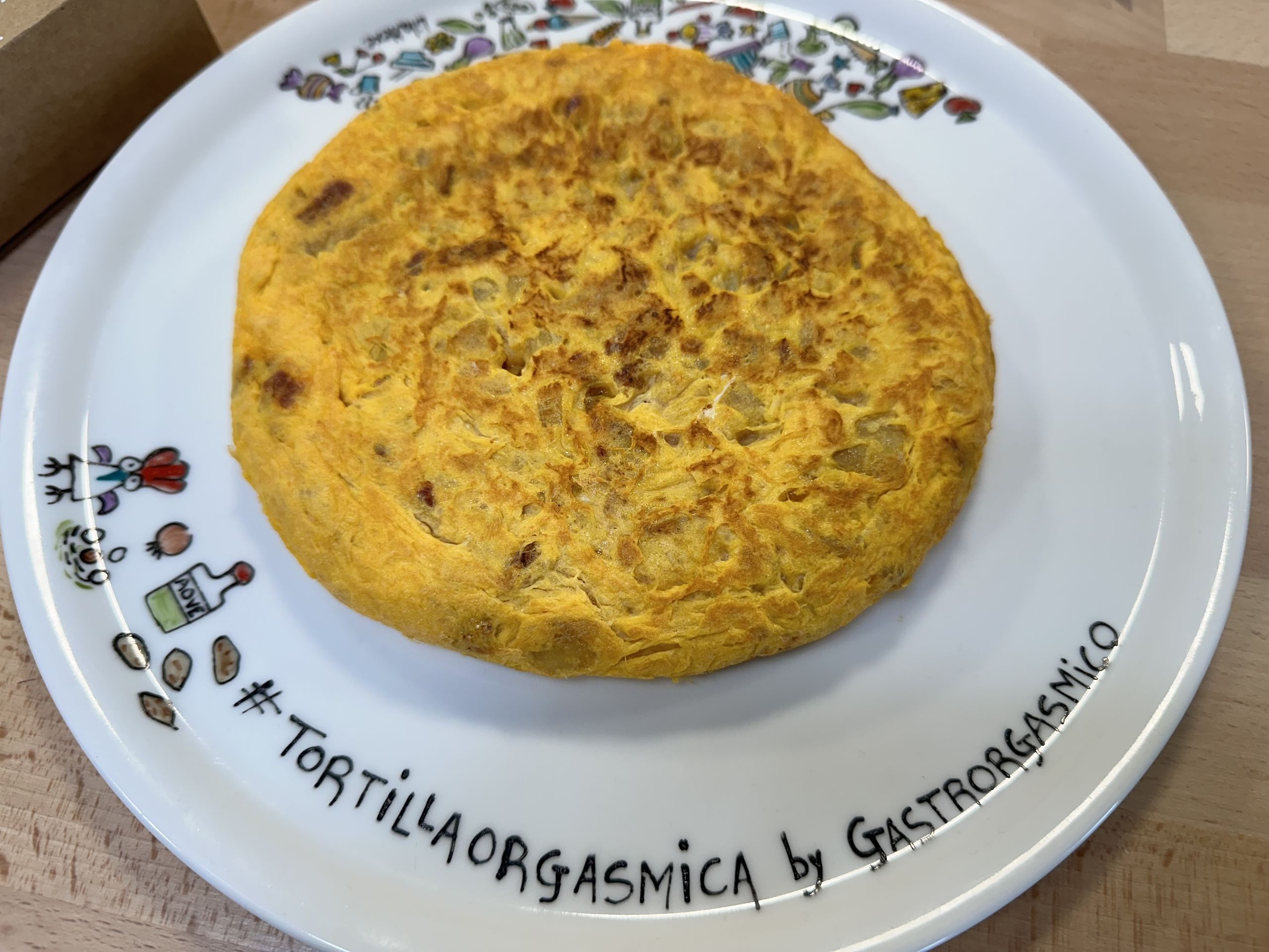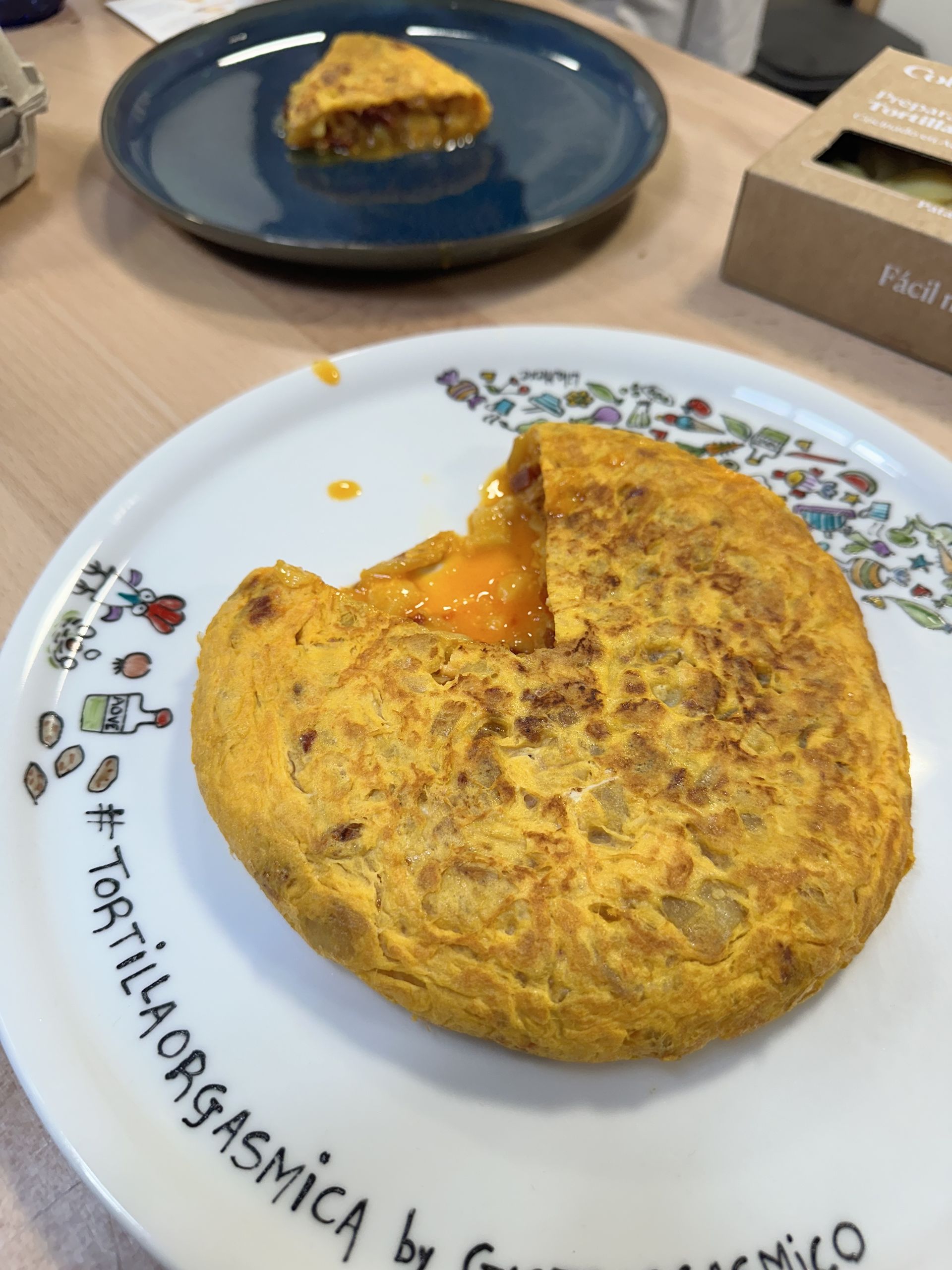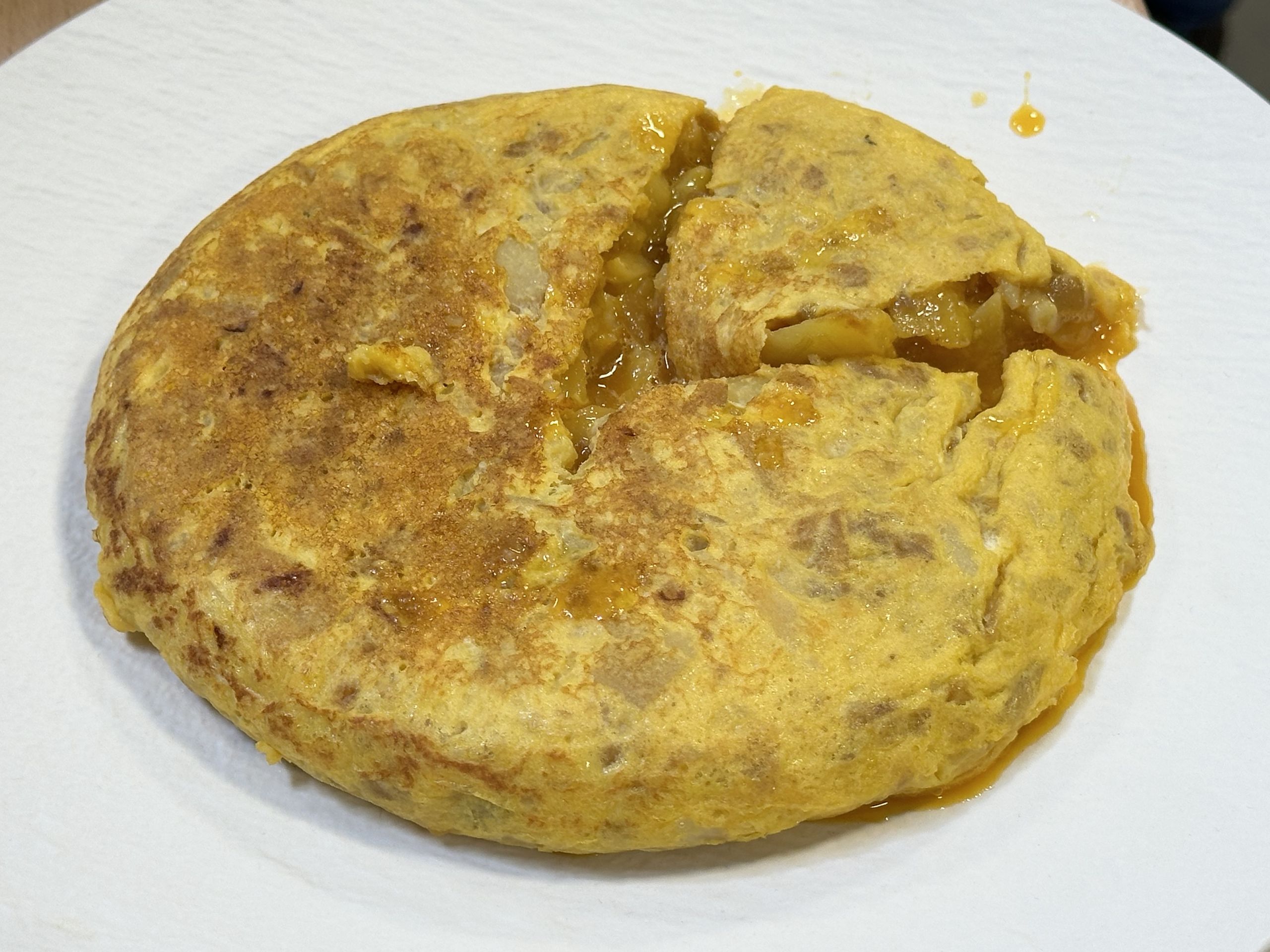 La tortilla de patata de Gastrorgásmico elaborada con el preparado de Cobardes y Gallinas y ya servida en la que se aprecia el punto poco cuajado del huevo.