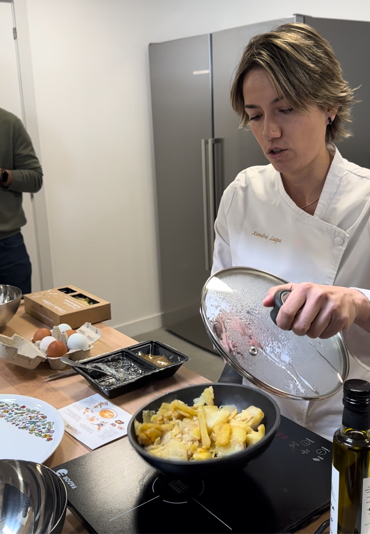 La chef Xandra Luque elaborando la tortilla de patata con el preparado de Cobardes y Gallinas.