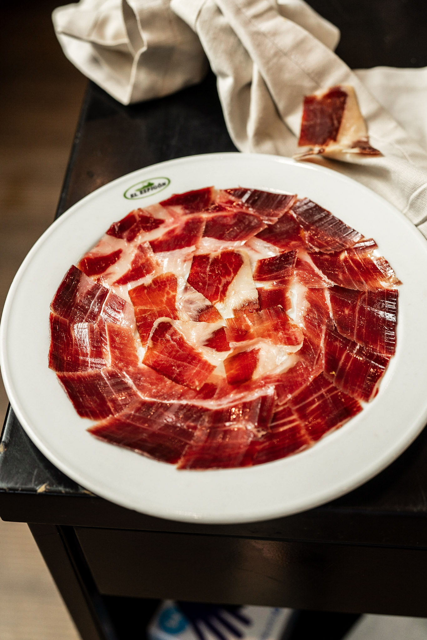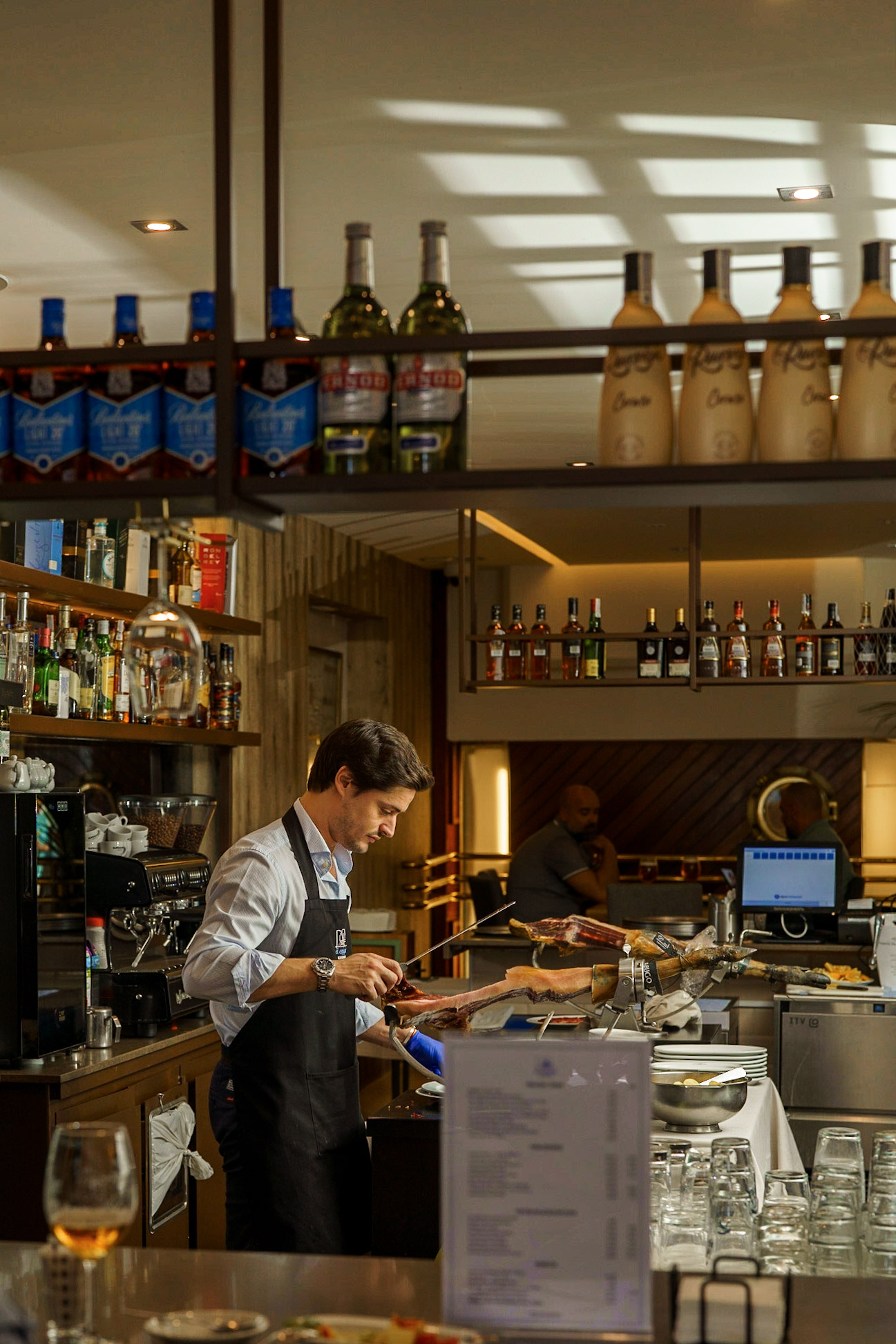 Carlos es el encargado de viajar a Huelva para comprar los mejores jamones ibéricos de bellota y de cortarlos para el deleite del comensal.