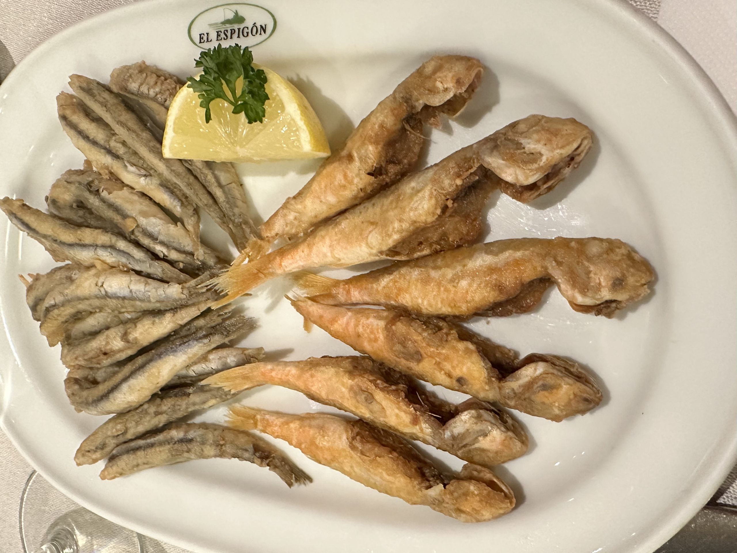 Hay que probar la fritura elaborada toda con aceitde de oliva, que en El Espigón la bordan, como con estos boquerones victorianos.