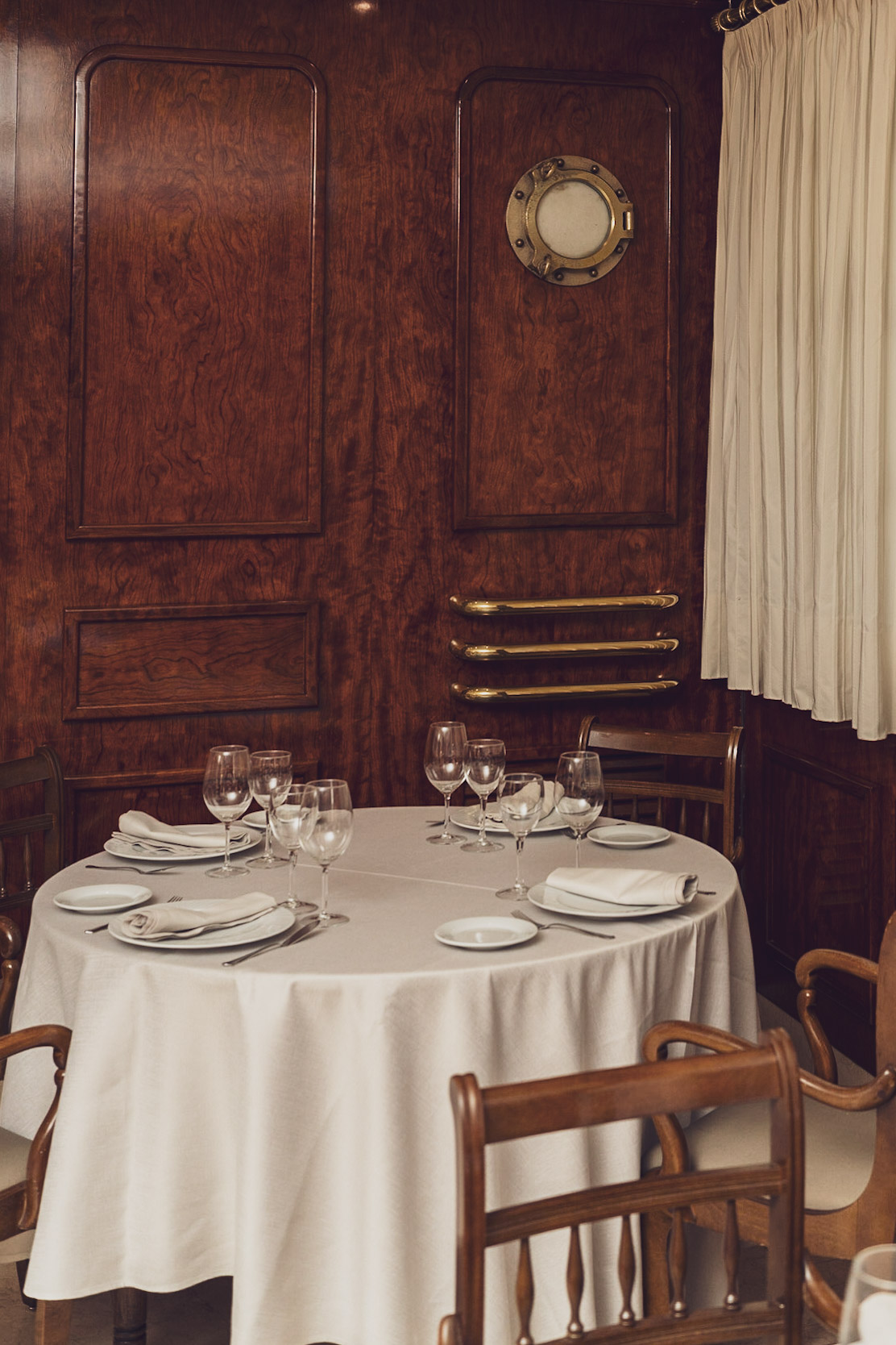 La madera y los detalles marineros acompañan en todos los salones y reservados de El Espigón, con sus mesas vestidas por manteles blancos.