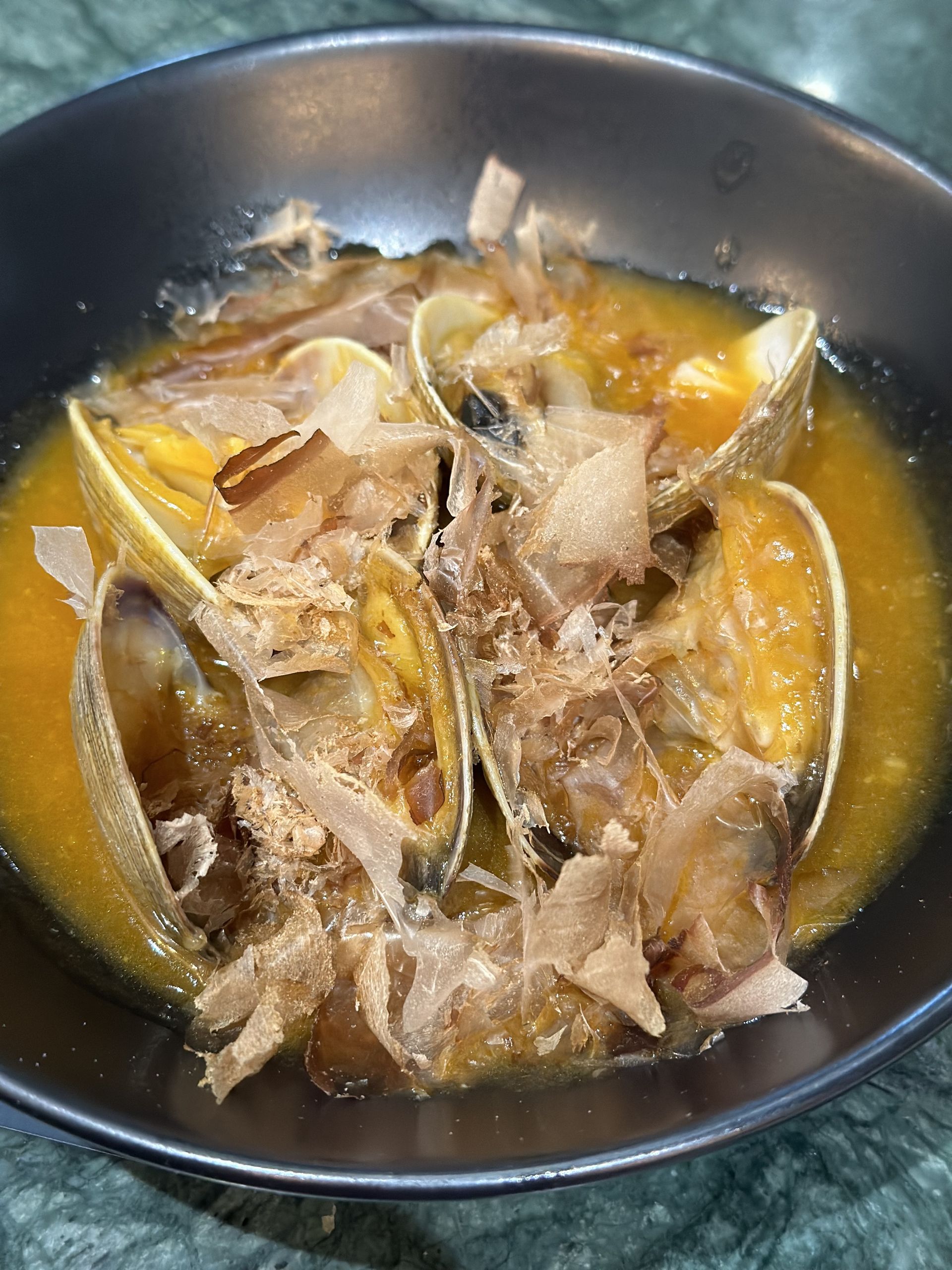 Otro platazo es el de almejas gallegas con marinera de pimentón y copos de katsuobushi. Colosales, de tamaño, de frescura y de sabor, la salsa es para untarse todo el pan, aunque tienen el puntazo de ponerte una cuchara para que te puedas tomar la salsa a cucharadas. El atún desidratado le da un punto más se sabor a mar.