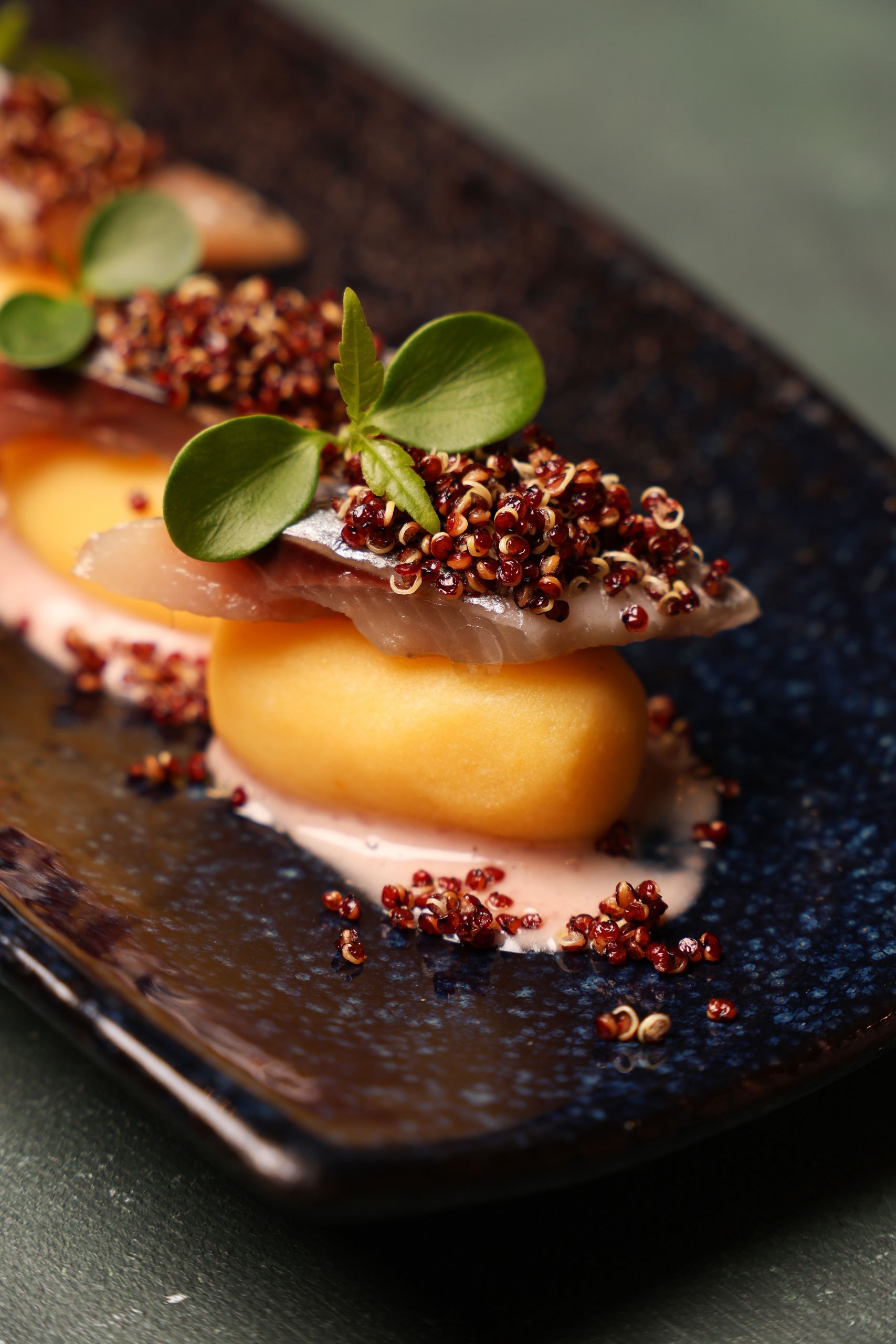 Causa limeña, sardina ahumada de Santoña y aceitunas de botija.