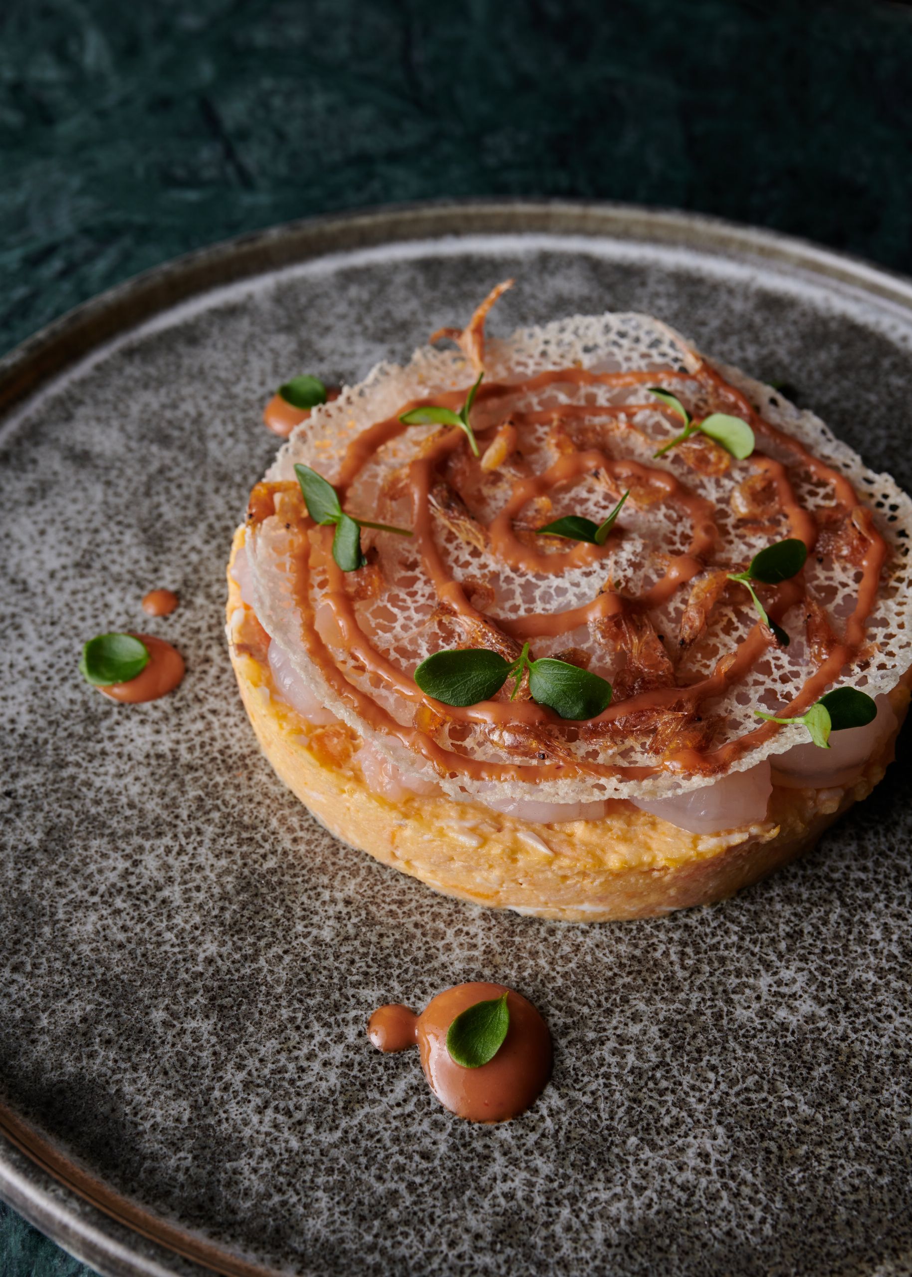 Su ensaladilla rusa con gambas y tortillita crujiente de camarones va coronada con una salsa americana preparada con la reducción de las cabezas del carabinero y entre cada bocado te encontrarás las gambas muy poco cocidas.