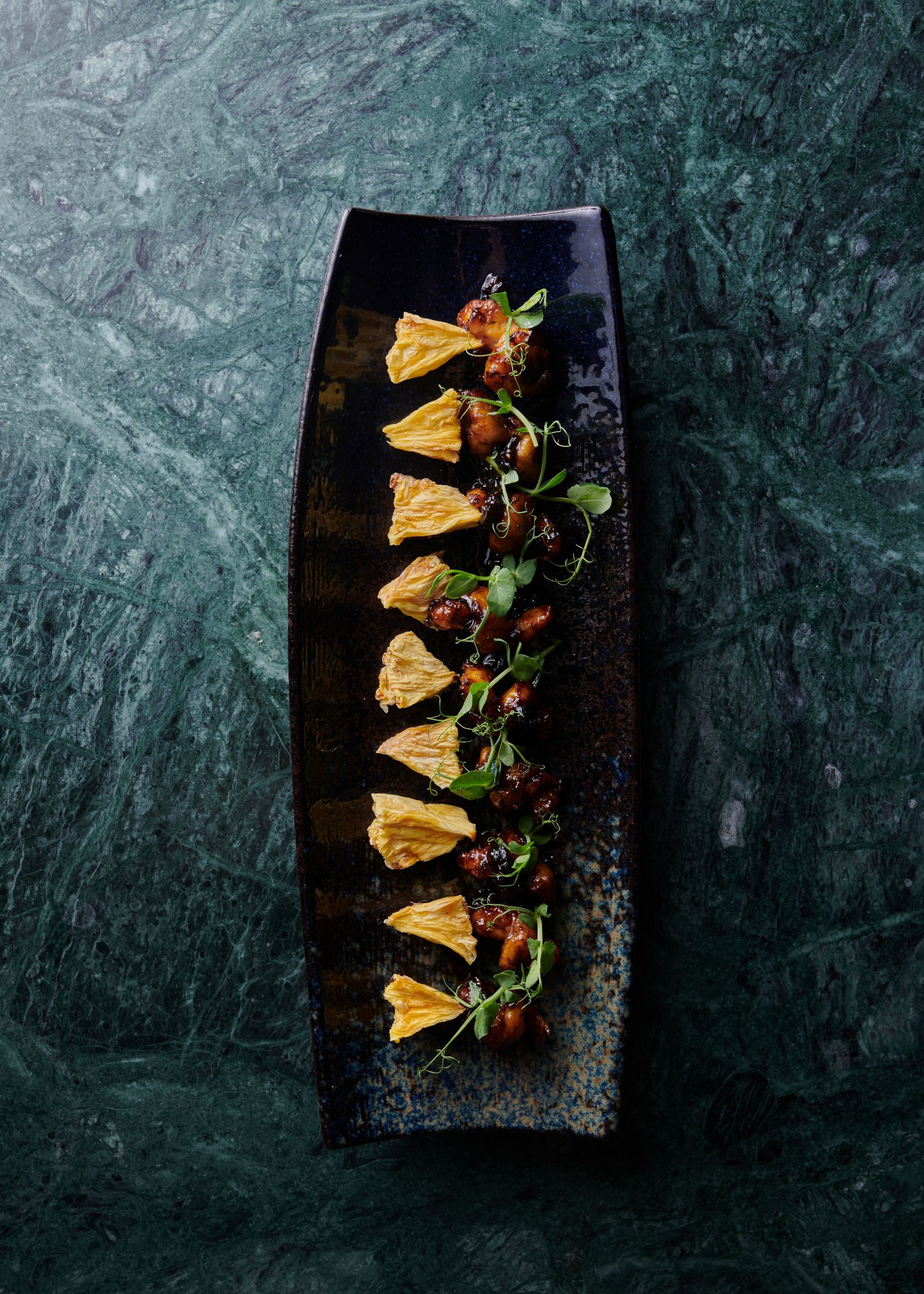 Siguen llegando esos platos que te llevan de un lugar a otro del planeta como los langostinos salteados al wok con la salsa de soja y pimienta con piña seca y brotes de guisante. Este plato tienes que comerlo un trozo de piña y otro de langostino para saborear el poco jugo que queda de la fruta para suavizar el sabor del marisco que queda potenciado con la salsa.
