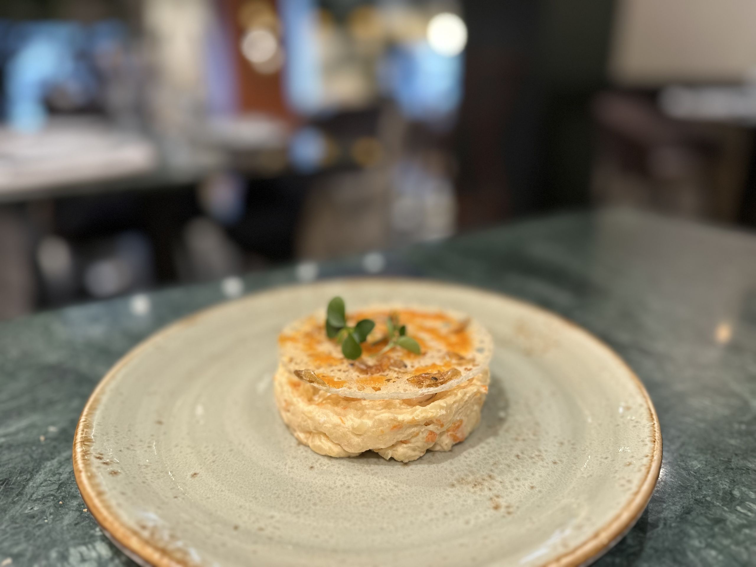 Una de esas patas y la más importante es la cocina, pensada para compartir y con un gran protagonismo de la parrilla, como veremos en los platos principales. Para entrar en calor comenzamos con un aperitivo de crema de calabaza con comino, canela y panko para darle un toque crujiente a la cucharada. Como cuentan a Libertad Digital, estos aperitivos van cambiando a diario y en función de la estacionalidad, como puede ser el gazpacho que elaboran, que es una sopa de tomate pero asado. Siguiendo con platos que vienen de maravilla con el mal tiempo, unos deliciosos dumplings de ropa vieja con caldo filtrado de cocido (12€) para el que preparan el cocido "como se ha hecho toda la vida en casa" y elaboran una ropa vieja con pimentón y cebolla. El caldo está clarificado por lo que le quitan toda la grasa pero mantiene todo el sabor.