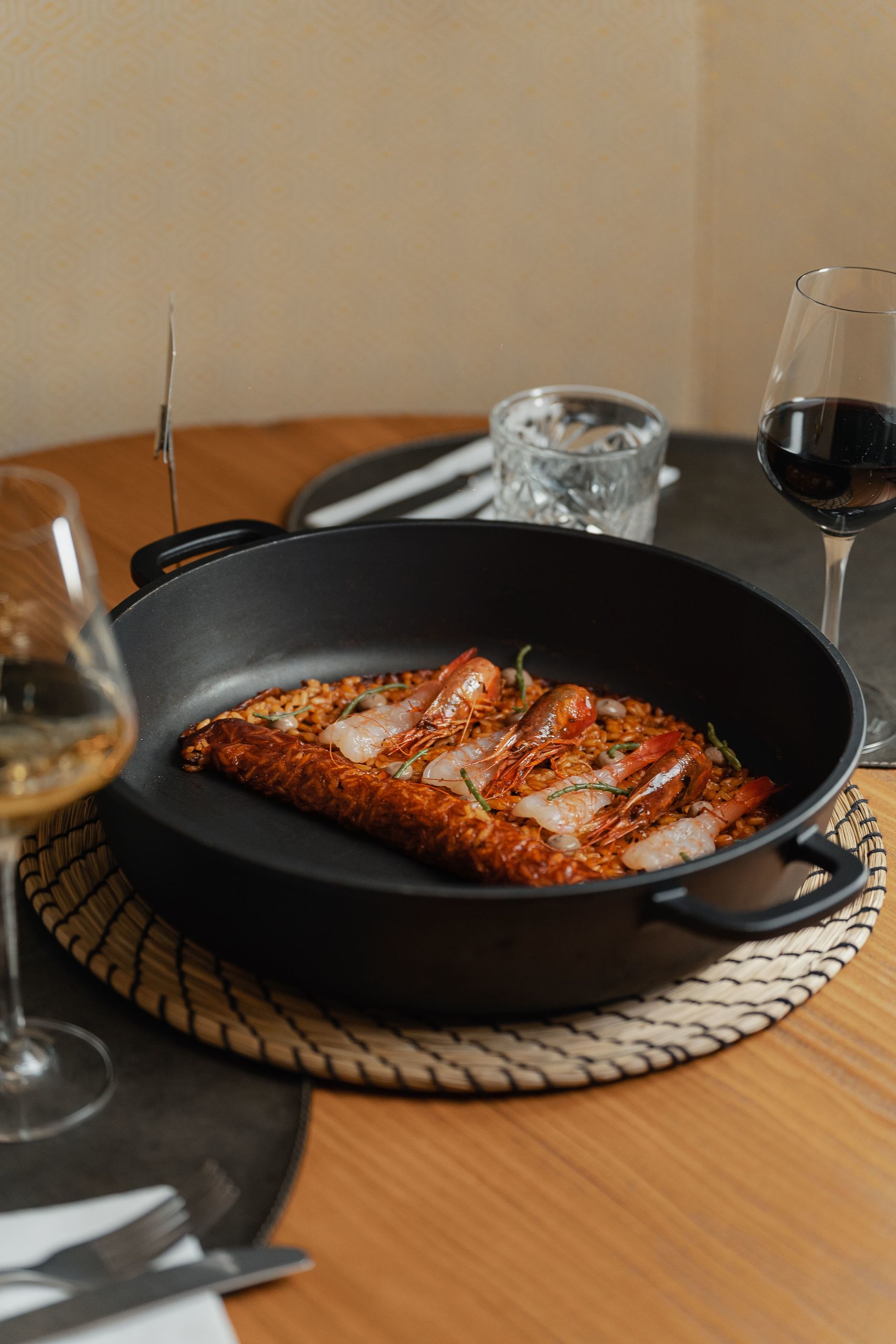 Otra novedad cada vez más de moda como el arroz socarrat de gamba roja con emulsión de alioli de ajo negro y salicornia. De nuevo buen producto y una perfecta elaboración con el punto del arroz.