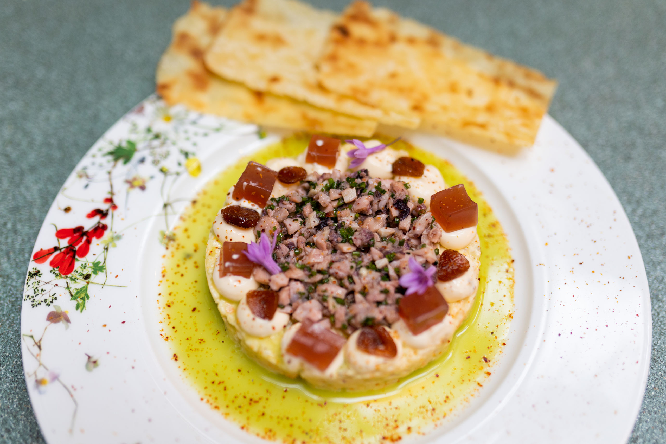 Fantástica también la ensaladilla rusa de pulpo al ajillo, con salsa de aceituna manzanilla, tomillo y mayo-ajillo.