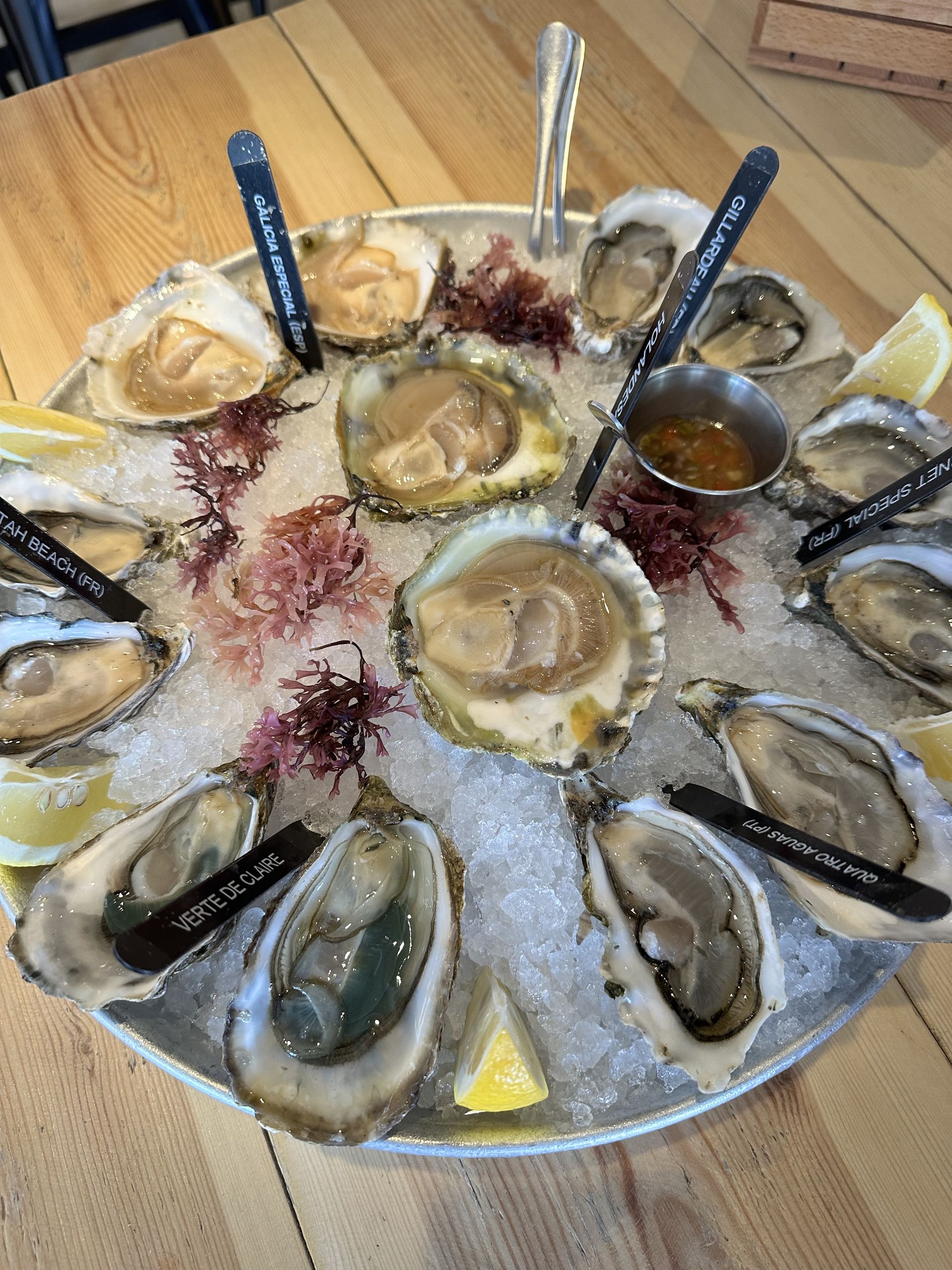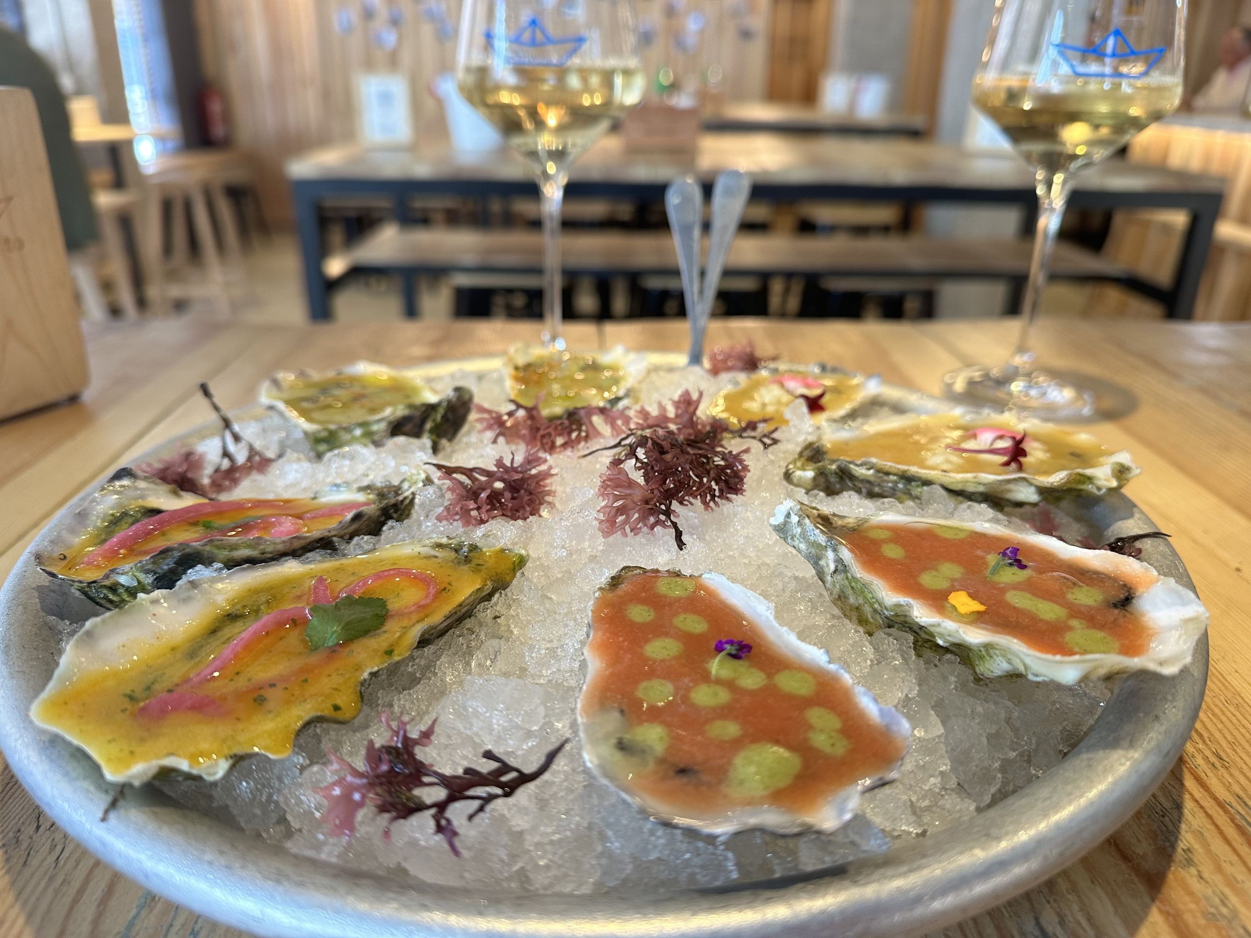 Degustación de ostras naturales de El Puertito: Gillardeau (FR), Vernet Special (FR), Quatro Aguas (PT), Verte de Claire (FR), Utah Beach (FR), Galicia Especial (ESP) y Holandesa (PB).