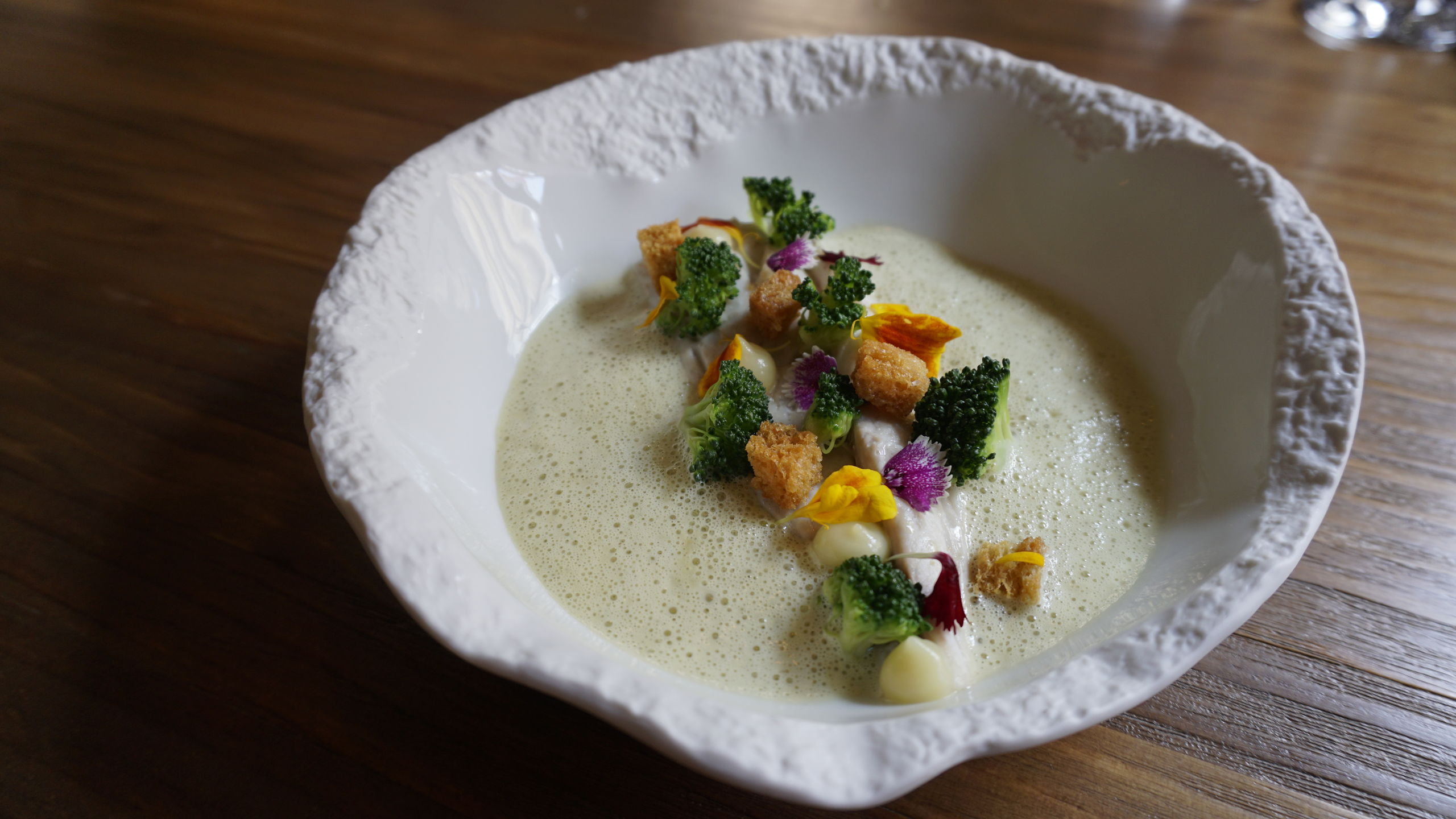 Magnífica dorada a baja temperatura, con una base de puré de brócoli, sobre la dorada unos puntitos de gel de limón, trocitos de naranja, pan tostado, brócoli asado, flores y una emulsión de curry verde.