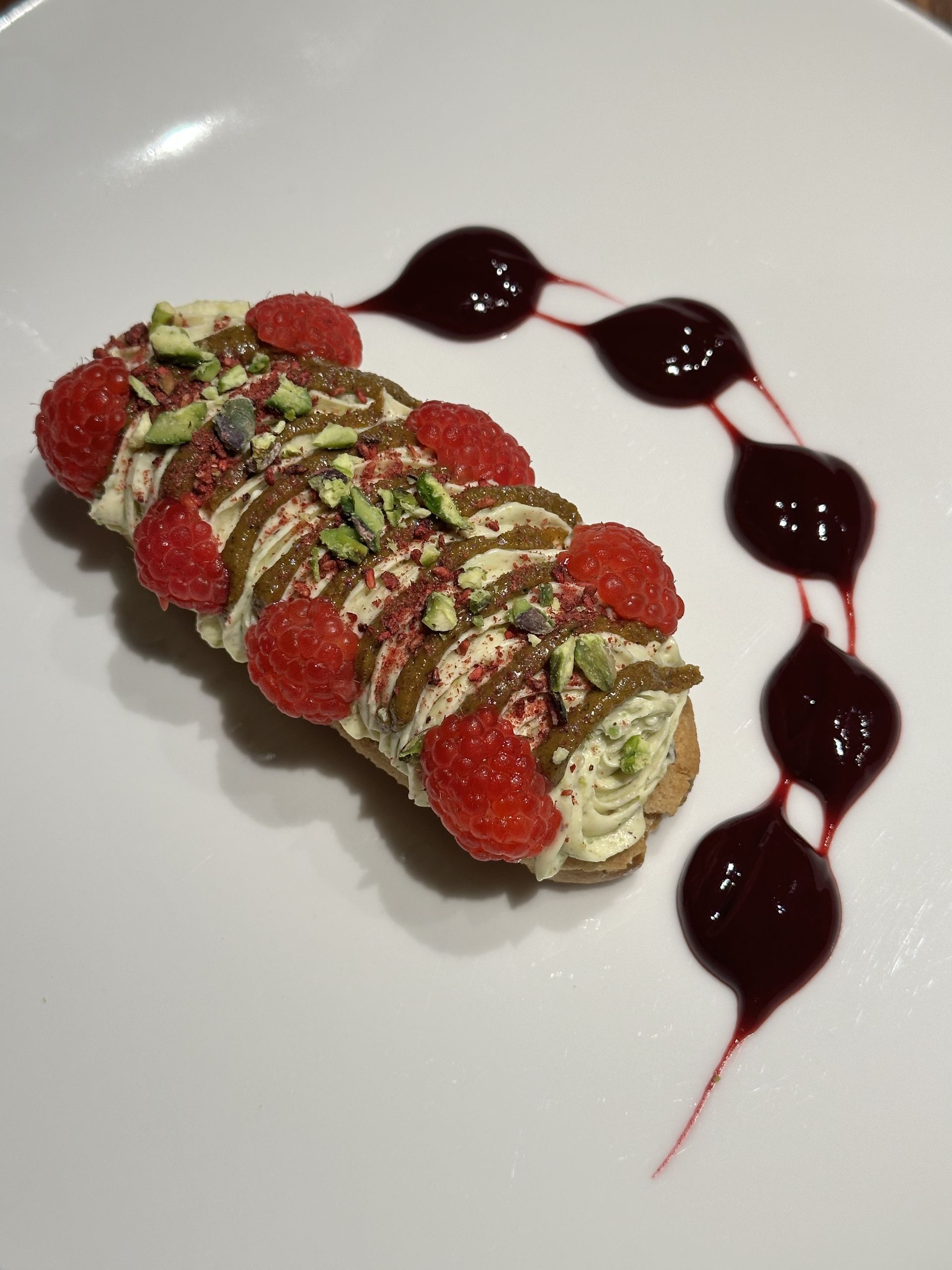 Para los postres, los dos socios franceses se han rodeado de su compatriota Victor Bergerot, un maestro pastelero que también apuesta por los grandes clásicos de la pastelería gala pero reversionados. Así nos encontramos con un espectacular éclair pistacho, con crema de pistacho, vainilla, frambuesa, tan rico como contundente por lo que lo mejor es compartirlo.