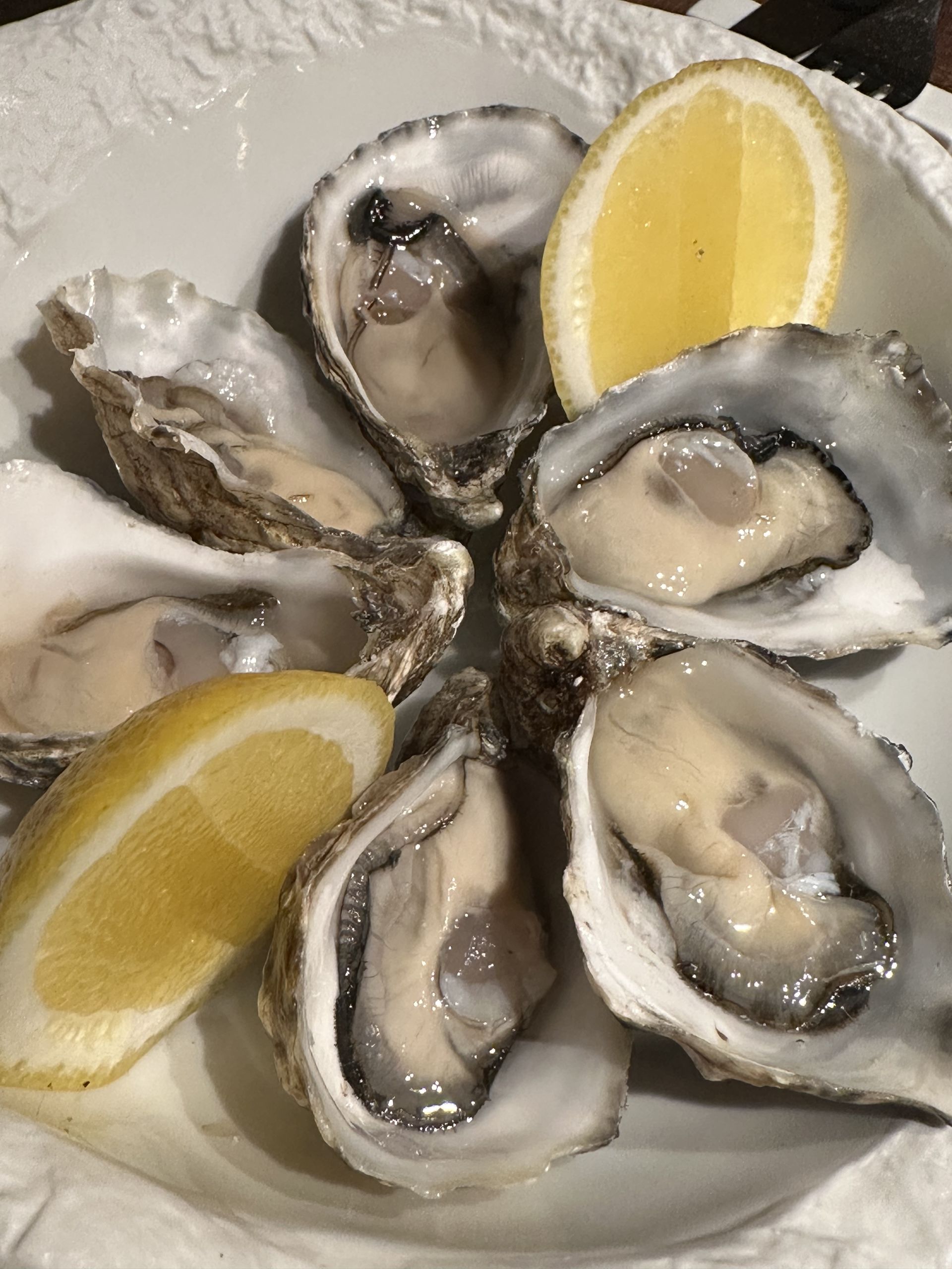 Comenzamos con unas muy buenas y carnosas ostras de la Saintonge, de la variedad Geay Friandises y criadas en Marennes d'Oléron, un pueblo de ostricultores al sur de La Rochelle.