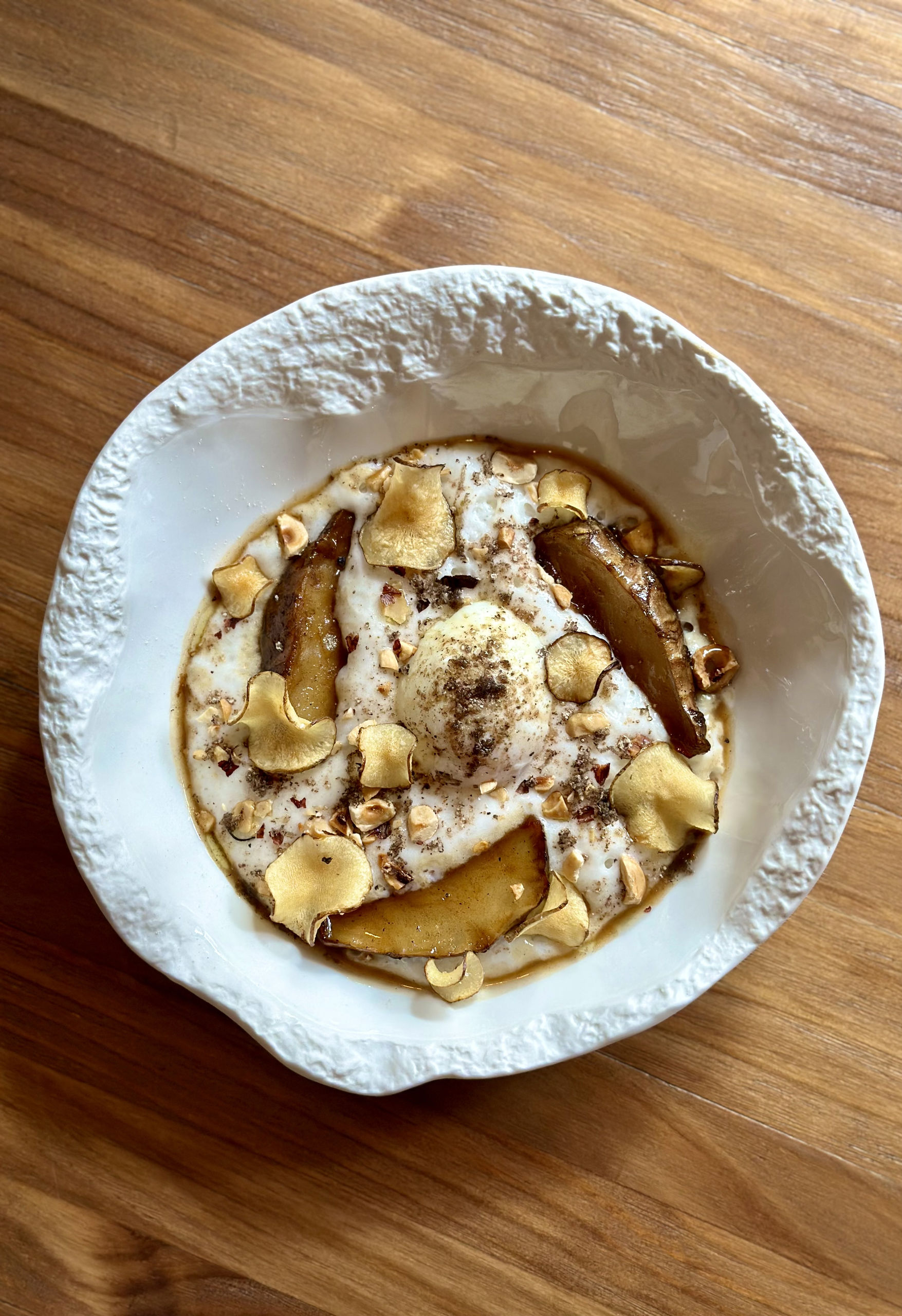 Topinambos en texturas, los topinambos lentamente asados y confitados, así como en espuma o en chips. En la base del plato hay una salsa a base de avellanas tostadas y un toque de café. También saborearás en el centro del plato un huevo perfecto, cocido a 64º exactamente. Encima para darle textura, unas avellanas tostadas y la truda de temporada rallada.