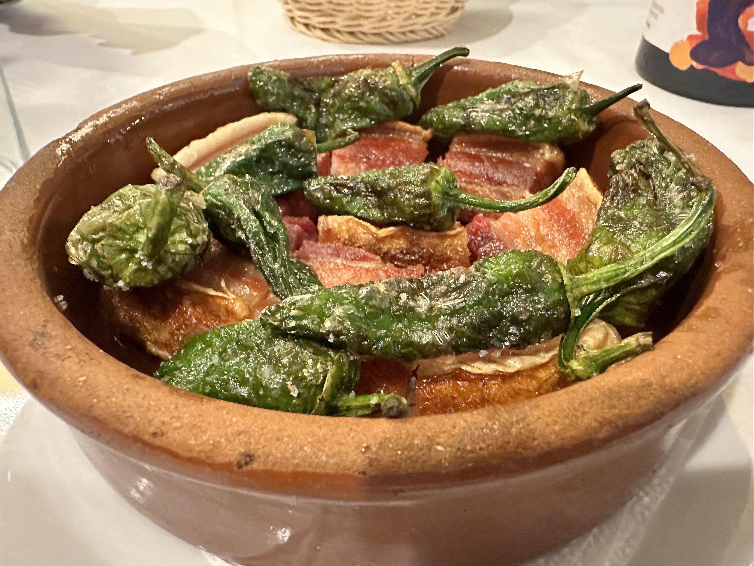 También puedes disfrutar para empezar de una morcilla artesana de Burgos elaborada tripa natural y acompañada de pimientos asados en casa o con la chistorra de Navarra frita a la cazuela con patatas panadera al horno. Y como no, con unos sabrosos y crujientes torreznos crujientes de Soria (15,50€) con pimientos de Padrón, esos que unos pican y otros no.