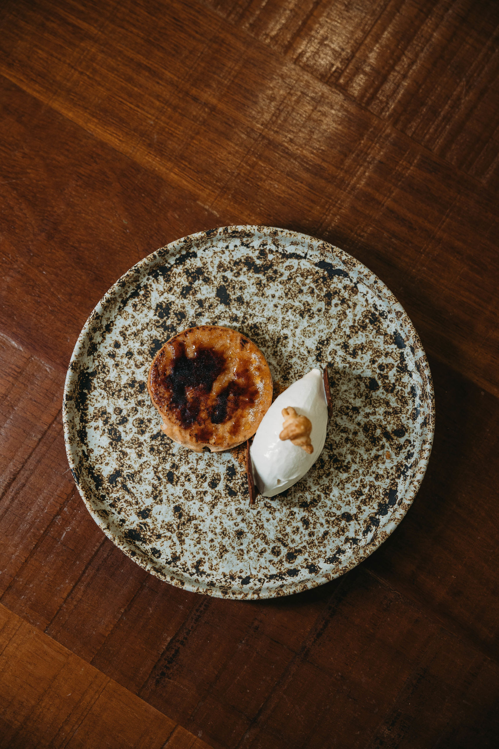 La parte dulce del menú mantiene el nivel con un prepostre de hojaldre caramelizado relleno de yema helada, crumble de pestiño, piña asada y sorbete de mango.