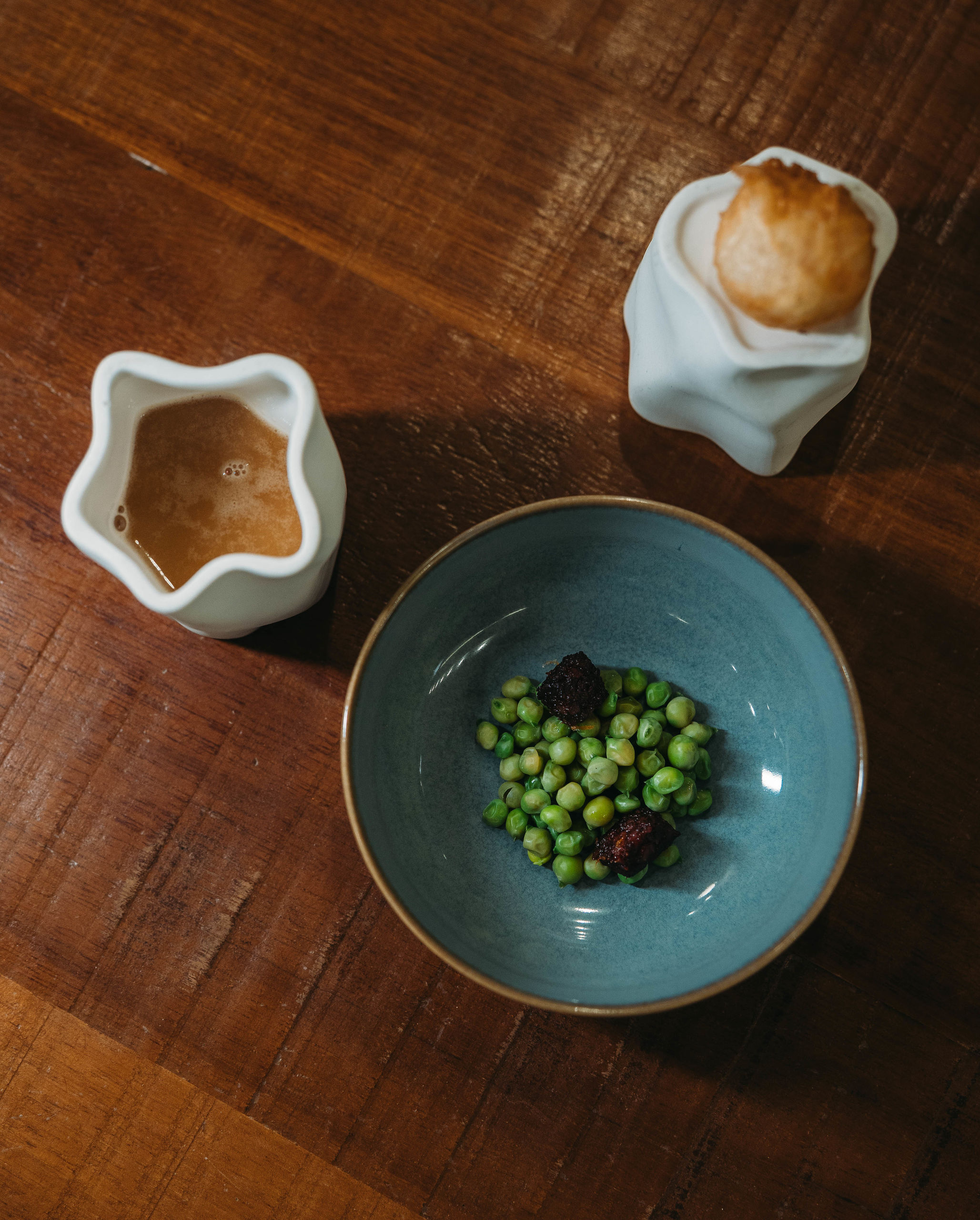 Guisantes de calidad, que no lágrima, con longaniza ibérica, caldo de jamón para llevártelo a casa y yema de huevo en tempura, servido en dos pases.