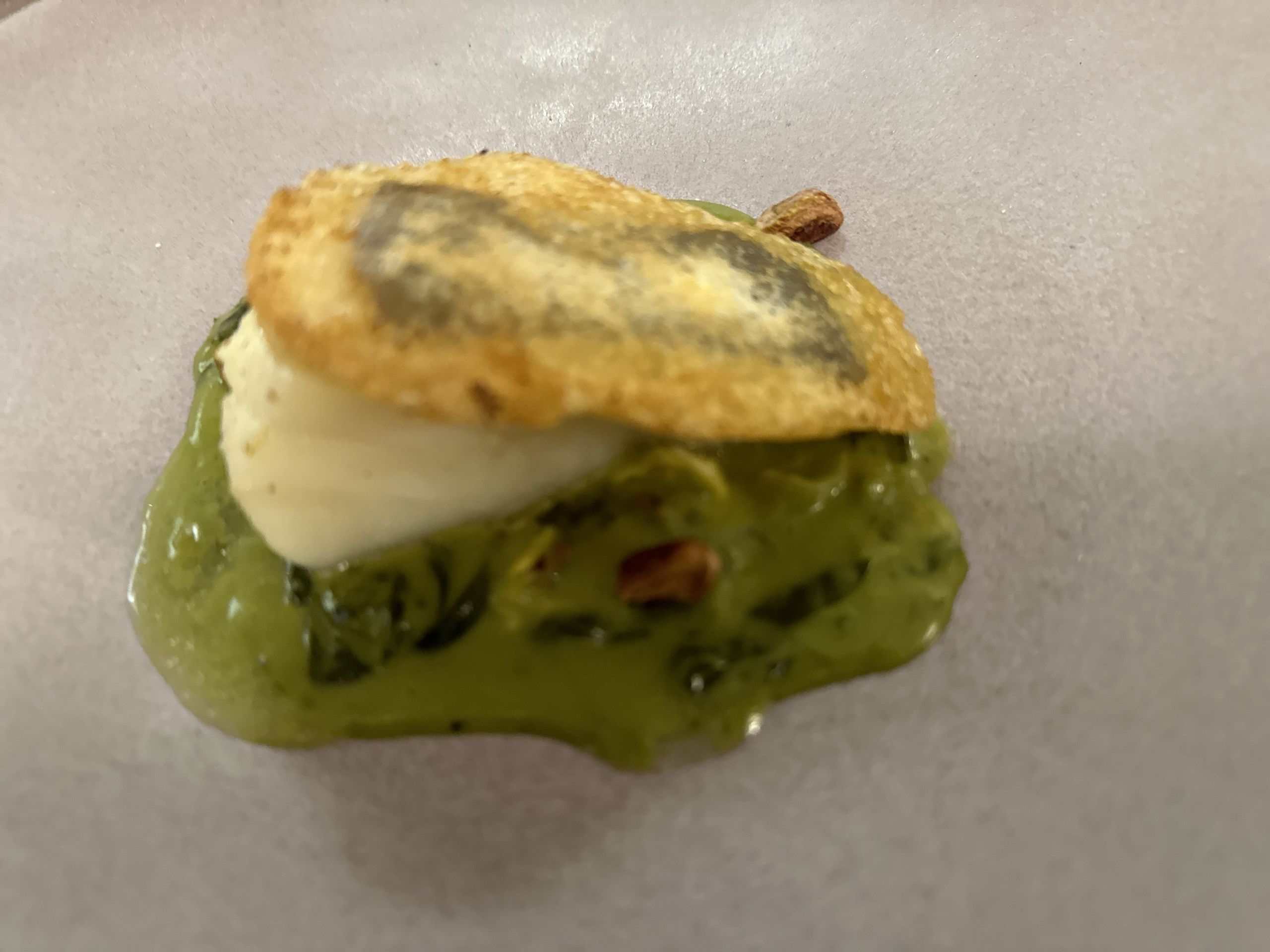 Muy buen bacalao con crema de espinacas y pistachos. El toque crujiente de la piel del pescado aporta una textura especial al plato al igual que el sabor de la crema elaborada leche de oveja y de cabra.