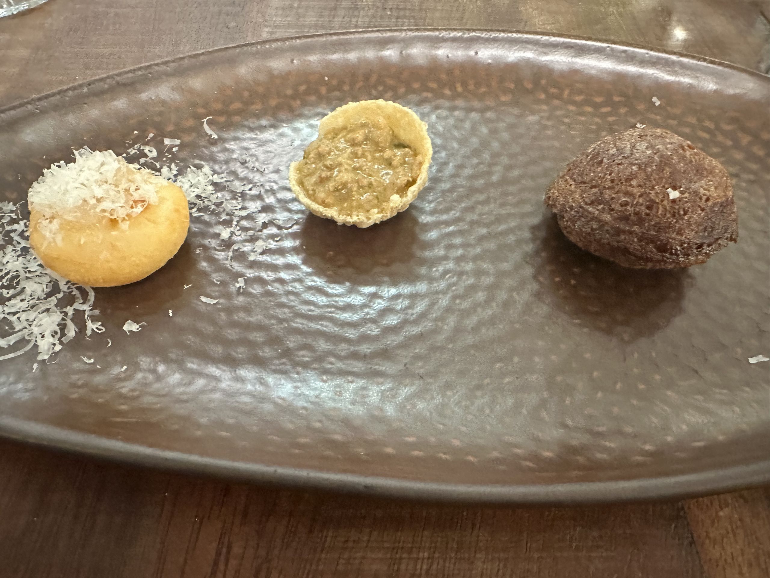 Espectacular buñuelo de foie, manzana verde y anguila ahumada.