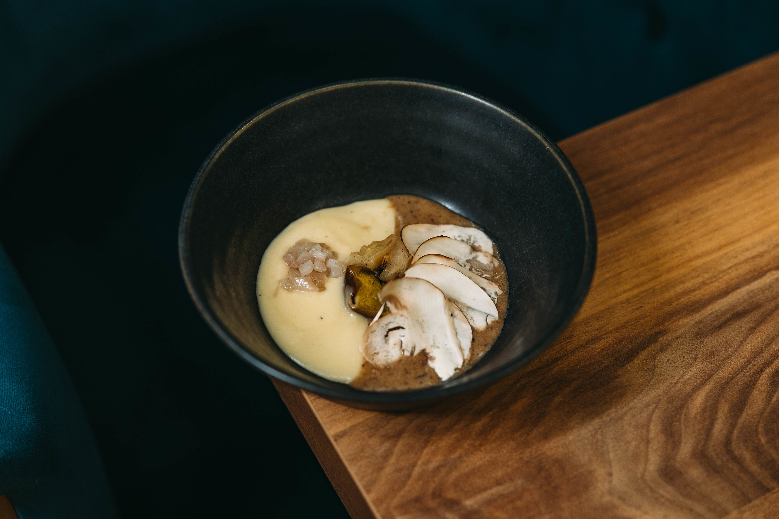 Unos puerros confitados y ahumados acompañados por una estupenda parmentier de patata y un delicioso pilpil de boletus.
