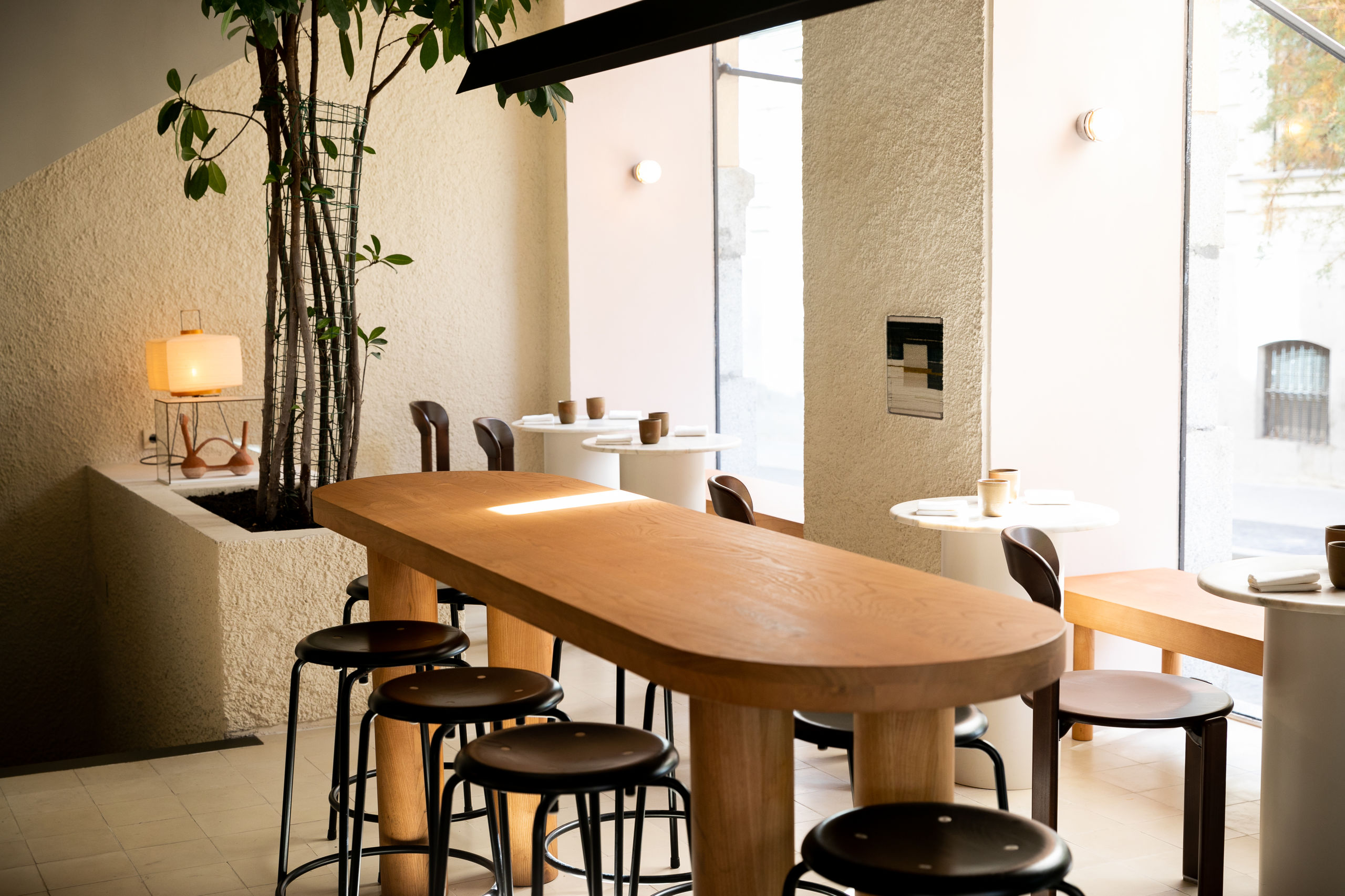 El interiorismo de Llama Inn está impregnado con materiales cerámicos, los revestimientos de madera y el diseño de mobiliario, además del uso atrevido y geométrico del color.