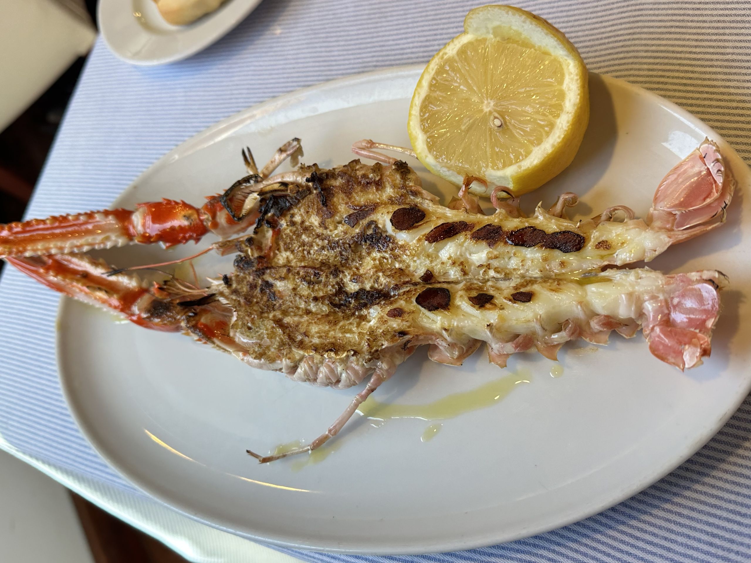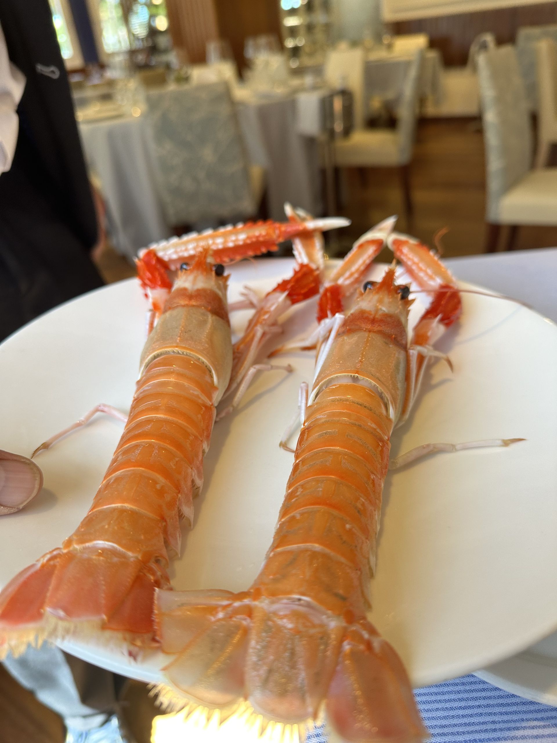 El camarero nos presenta las cigalas de tronco antes de pasar por la plancha.