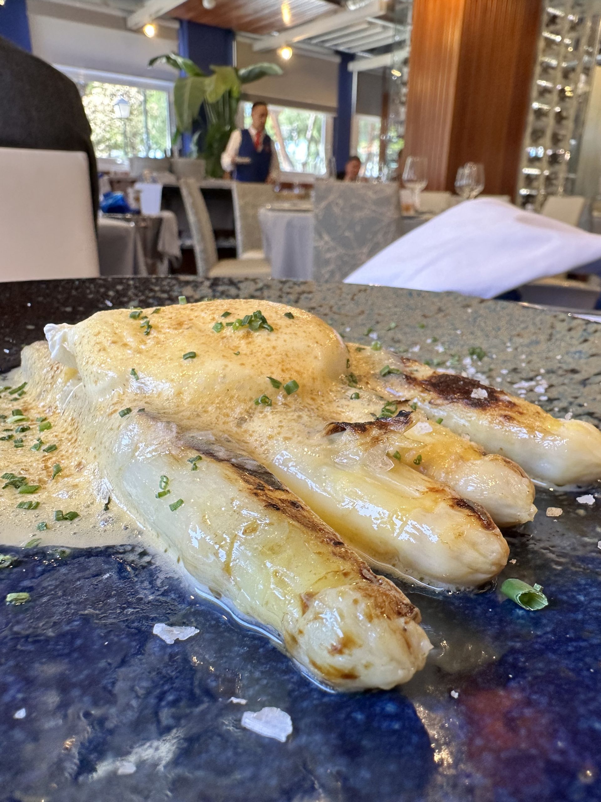 Extraordinarios espárragos pericos con huevo escalfado y salsa holandesa, en su punto perfecto tras pasarlos por la parrilla y perfectamente acompañados con la yema del huevo y la salsa.