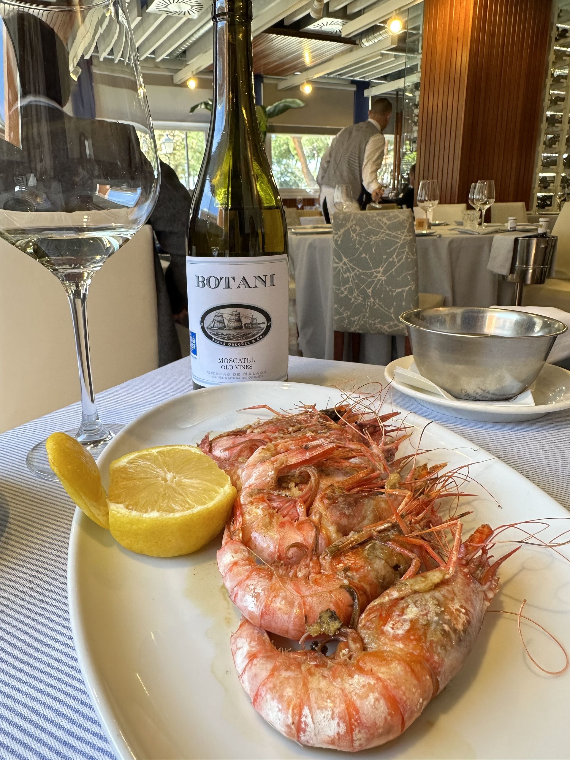 Y para regar la carta, la bodega de El Barril de La Morelaja no defrauda y asesorada por la sumiller del grupo, Gema Gordon, ofrece una amplia variedad de vinos nacionales e internacionales, además de espumosos que tan bien maridan con pescados y mariscos. En nuestro caso, un buen y suave vino blanco Botani (24,75€), de la Bodega Jorge Ordóñez y de variedad 100% Moscatel de Alejandría.