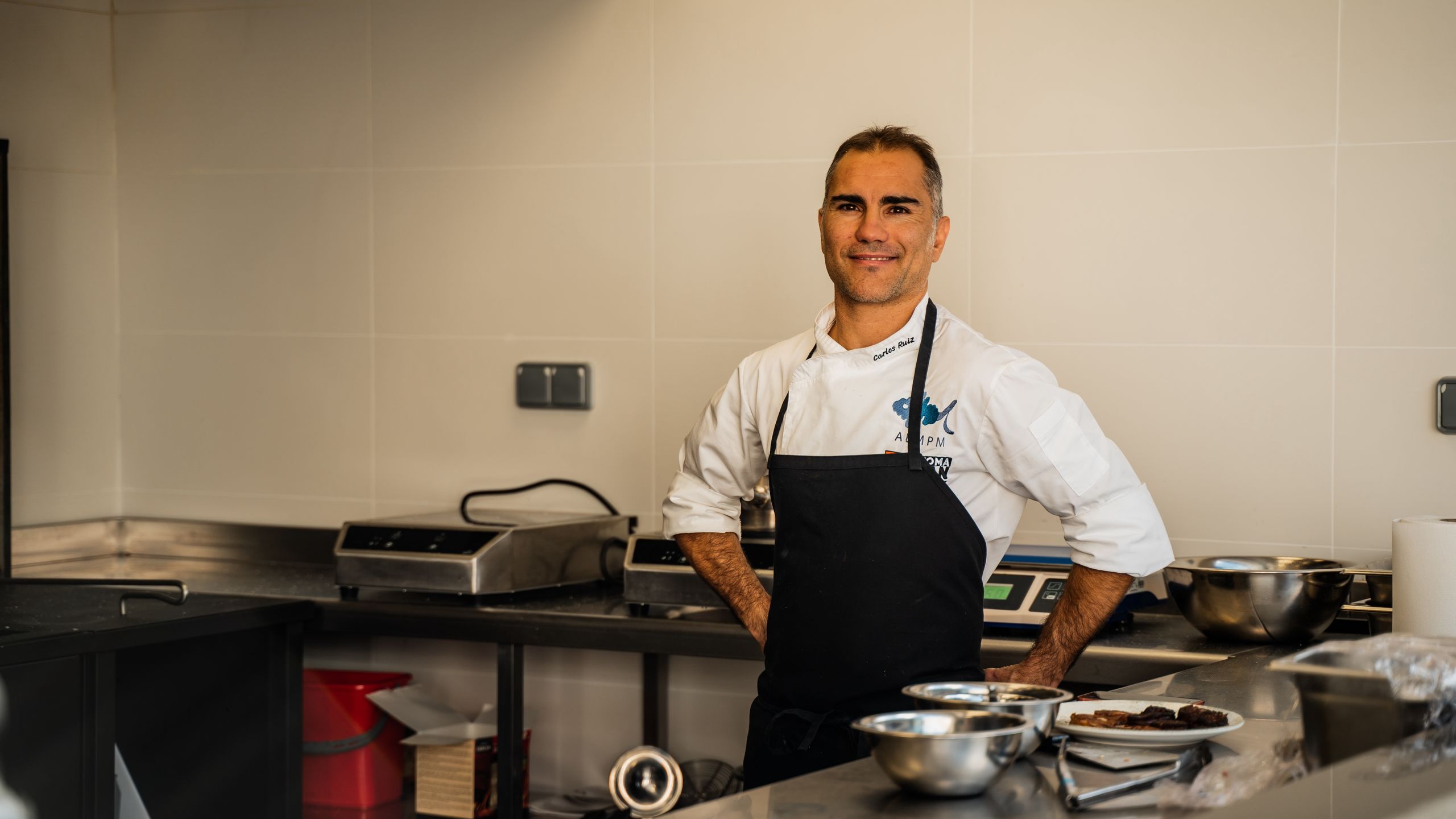 El chef Carlos Ruiz es el jefe de cocina y encargado de trasladar a la carta todo el buen producto que llega a Moscatel, un restaurante que recibe el nombre gracias a la parra centenaria de uva Moscatel que se encuentra en el huerto.