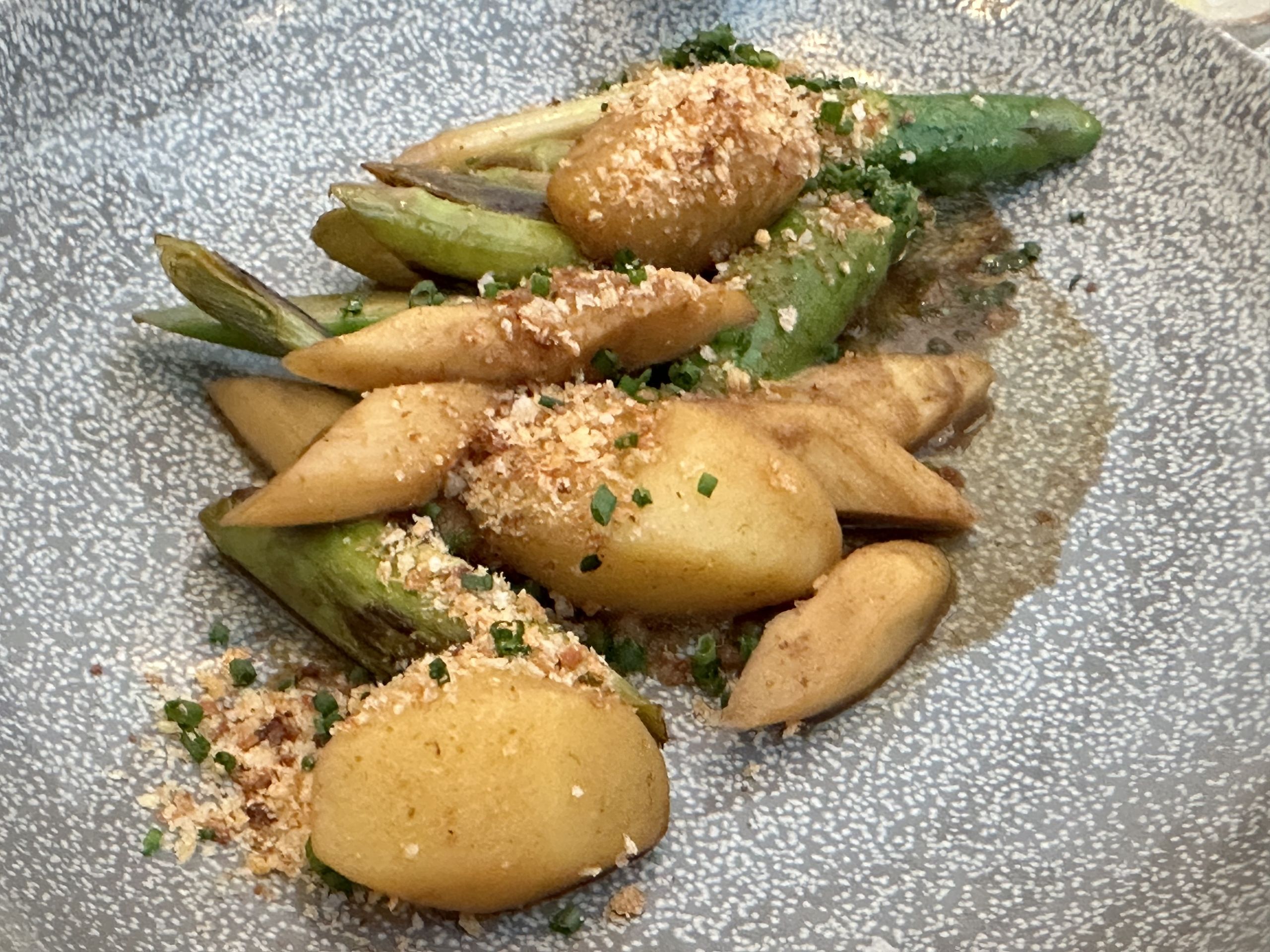 En temporada y para los amantes de esta hortaliza, un dúo de espárragos blancos y verdes con ajetes de nuestro huerto y pan frito.