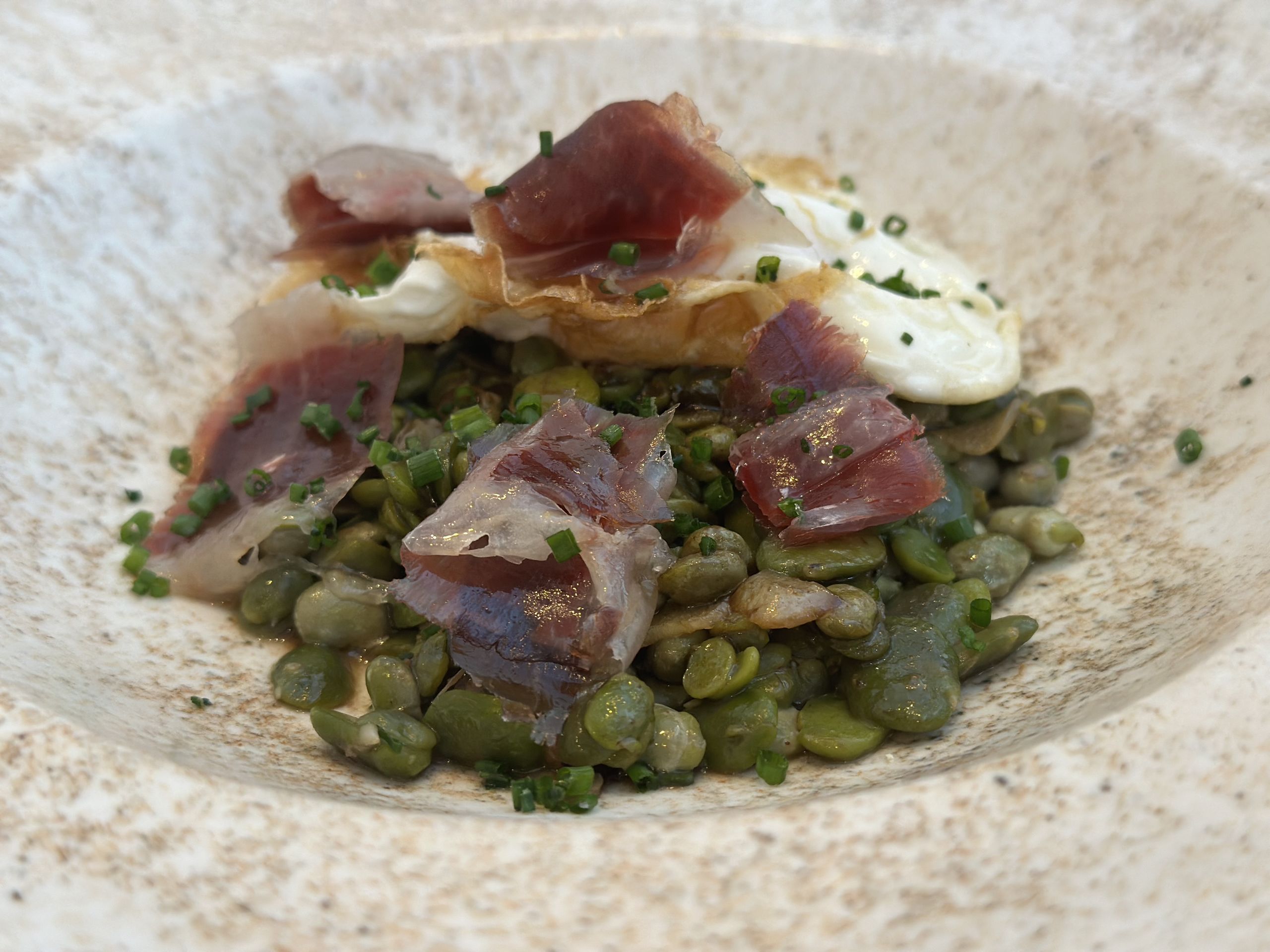 Tuvimos la suerte de probar las primeras de la temporada, unas maravillosas habitas de la huerta con huevos fritos y jamón Alta Expresión COVAP.