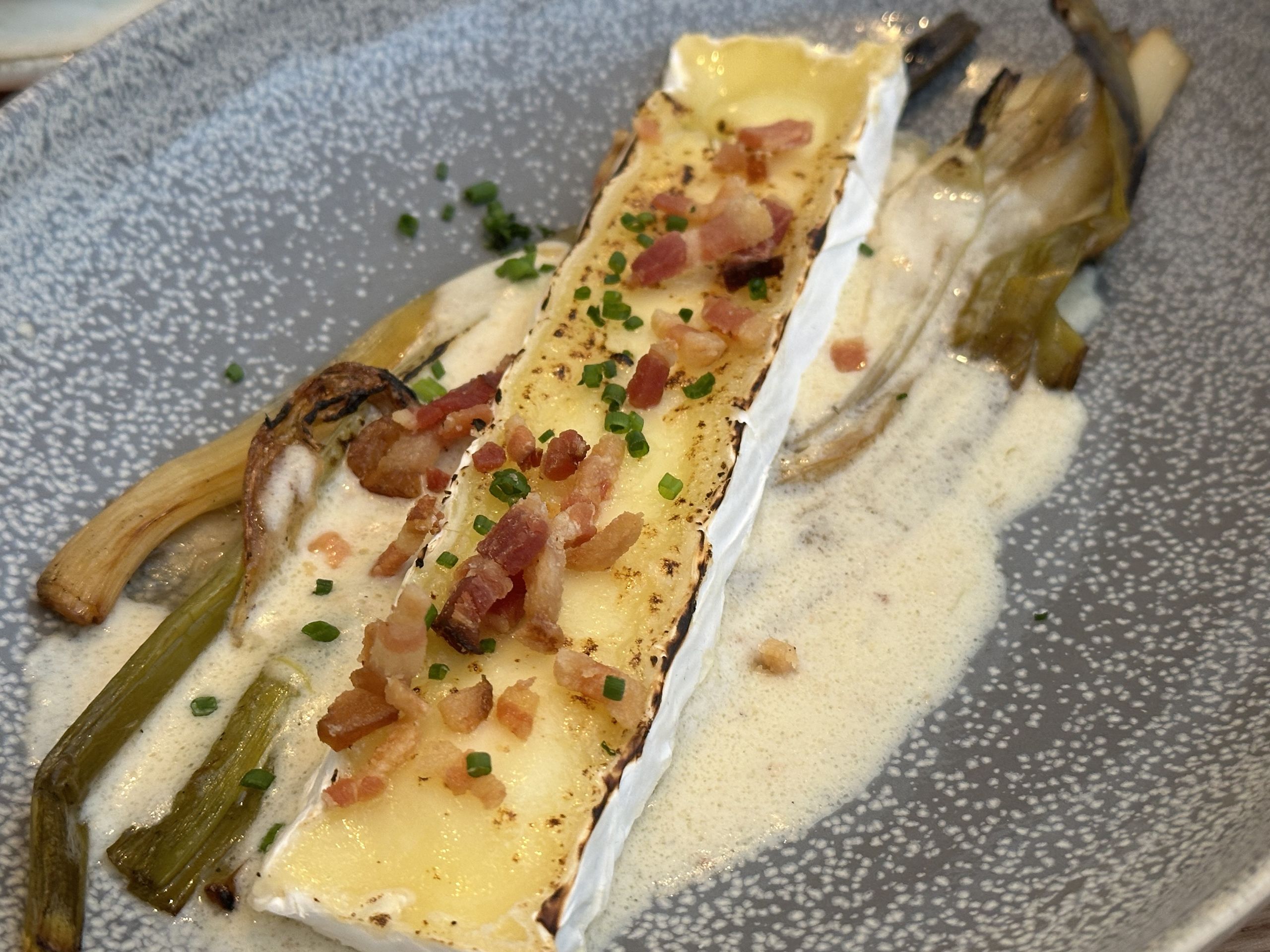 Puerritos de la vega del Jarama "Rivas Km 0" a la brasa con crema de queso brie y crujiente de bacon, con una buena materia prima pero en el que el sabor del queso sobresale ante el del puerro.