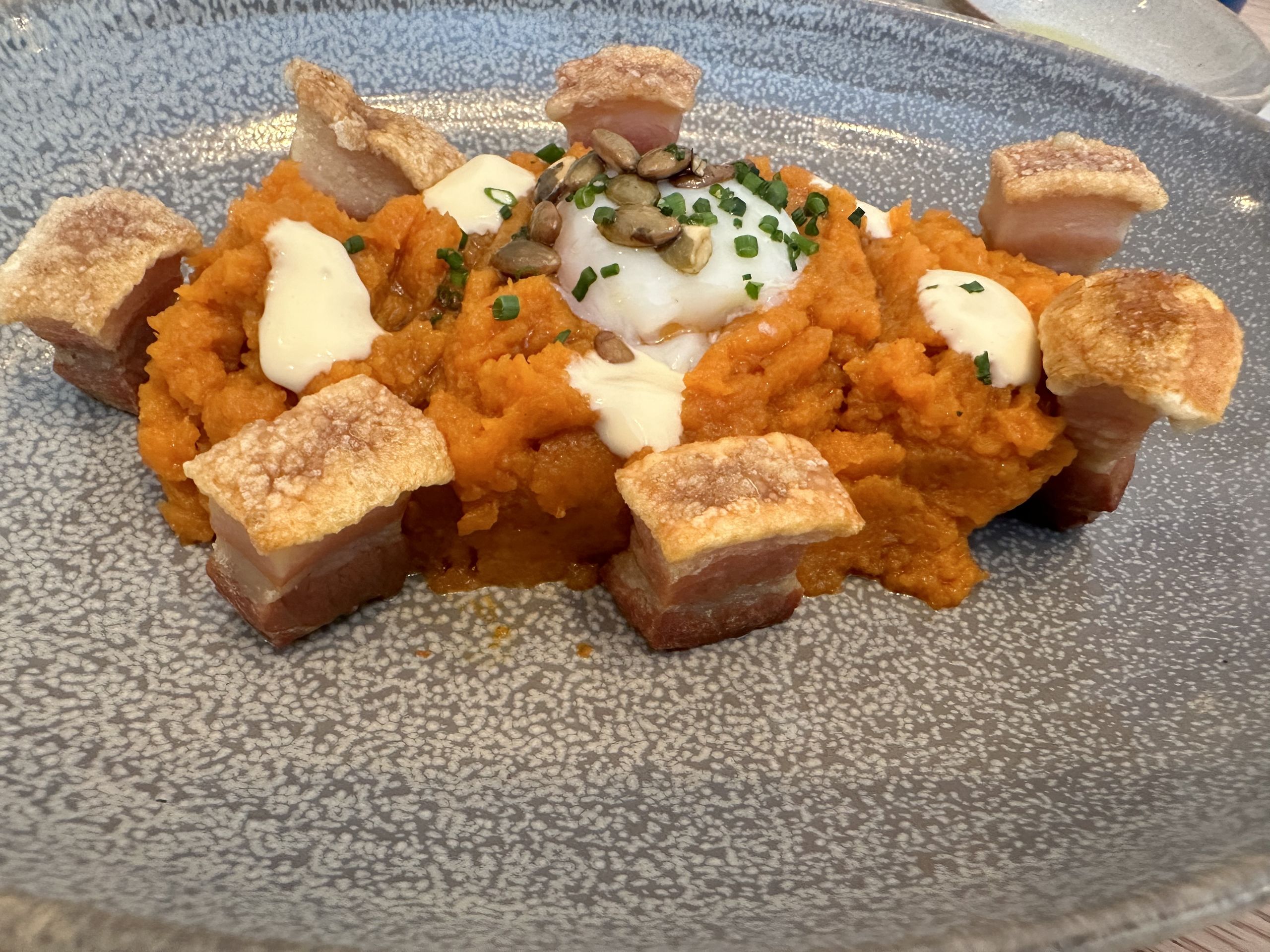 Revolconas de calabaza, torreznos y huevo pochado, ganador del Premio a la Mejor Tapa en la 6ª Edición de la Ruta de la Tapa de El Pardo. En este caso disfrutamos de una versión de las clásicas revolconas con torreznos, pero en lugar de patata usan calabaza, lo que le da un toque más dulce al plato, pero igual de delicioso. Las acompaña con un huevo pochado para romperlo y mezclarlo con la calabaza, sus pipas fritas y las tiras de tocino.