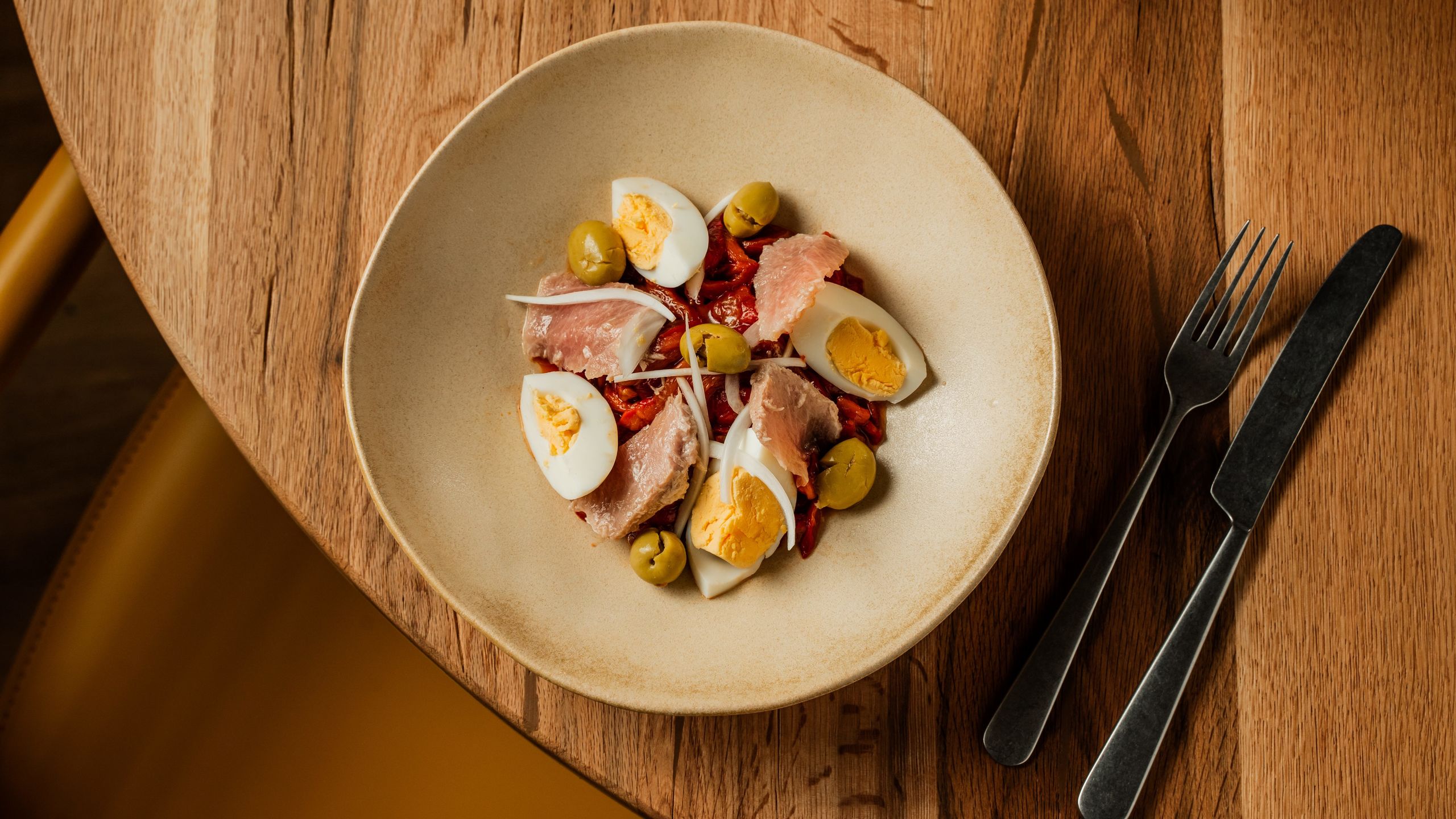 Buenísima ensaladilla rusa con ventresca casera de atún rojo, la segunda mejor de Madrid en 2023 y que tiene como secreto sus dos mayonesas, una para emulsionar los encurtidos, la piparra, la patata, el huevo y la zanahoria y la otra aireada e infusionada con el aceite de confitar la ventresca para cubrirla, todo coronado con alcachofa, guindilla verde y ventresca y terminada en mesa con un AOVE de Castillo de Canena.